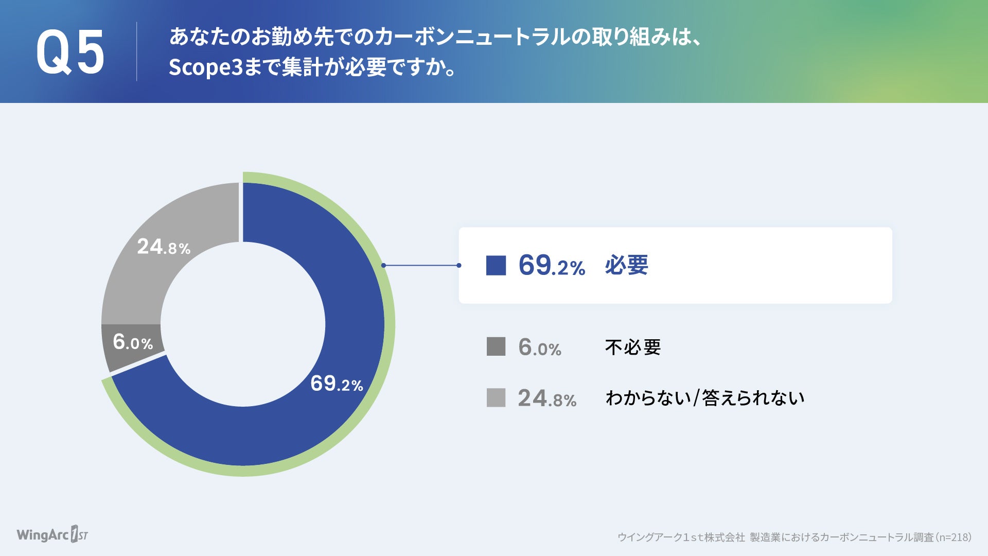 Q3で「現在取り組んでいる」と回答した方に、「Q5.あなたのお勤め先でのカーボンニュートラルの取り組みは、Scope3(※4)まで集計が必要ですか。」(n=218)と質問したところ、「必要」が69.2%、「不必要」が6.0%という回答となりました。