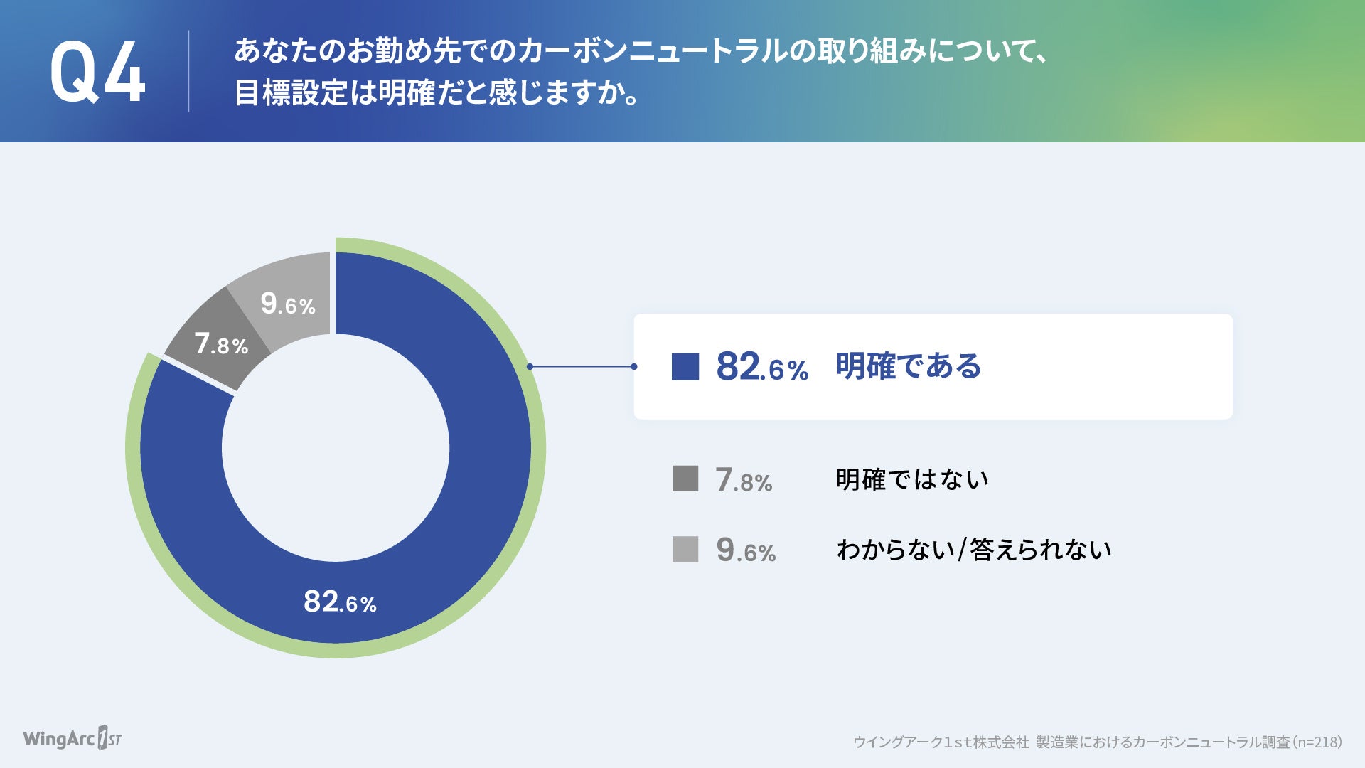 Q3で「現在取り組んでいる」と回答した方に、「Q4.あなたのお勤め先でのカーボンニュートラルの取り組みについて、目標設定は明確だと感じますか。」(n=218)と質問したところ、「明確である」が82.6%、「明確ではない」が7.8%という回答となりました。