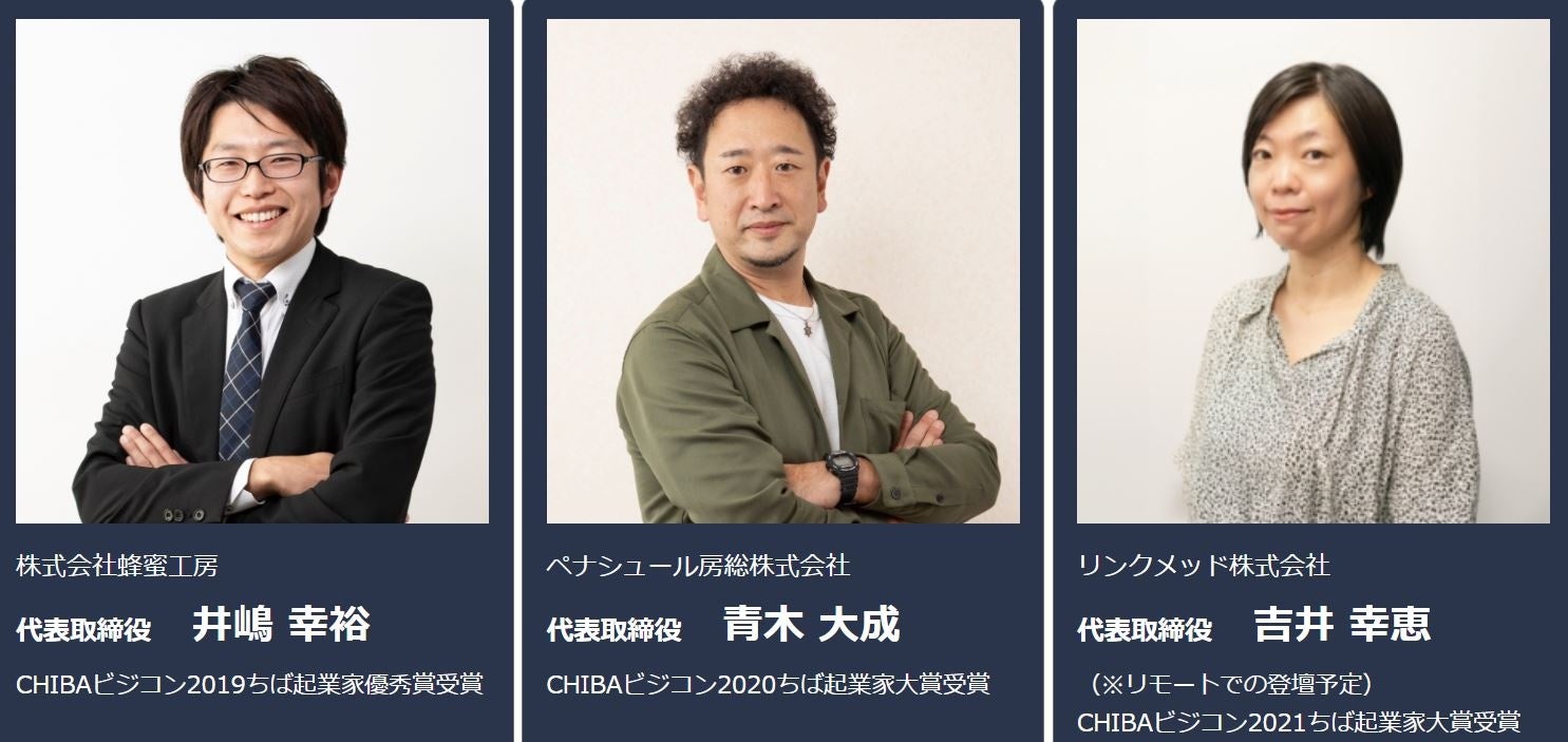 千葉県にゆかりのある3名が登壇。業種、業態、規模、経営スタイルが異なる起業家が、自らのストーリーと共に、自身の事業の現在、これからのビジョンについて語ります。