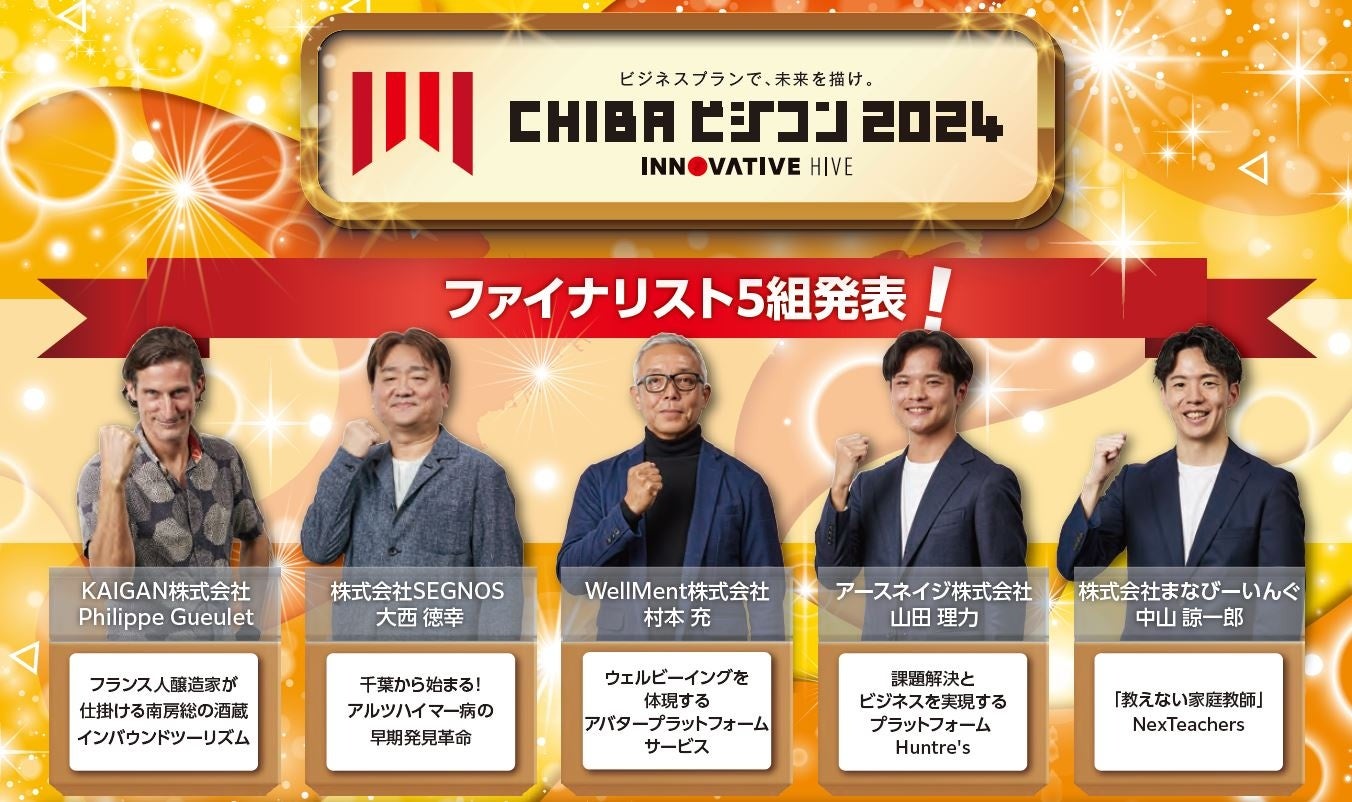 (1) 千葉県の活性化や課題解決につながるビジネスプランを広く募集し、2次審査を突破したファイナリスト5組が幕張メッセの舞台で最終プレゼンテーションを行います。審査員と来場者の投票により千葉県知事賞(ちば起業家大賞、優秀賞)が決定します。また、ファイナリスト5組を含む1次審査通過者から、サポーター賞の受賞者も決定し発表します!