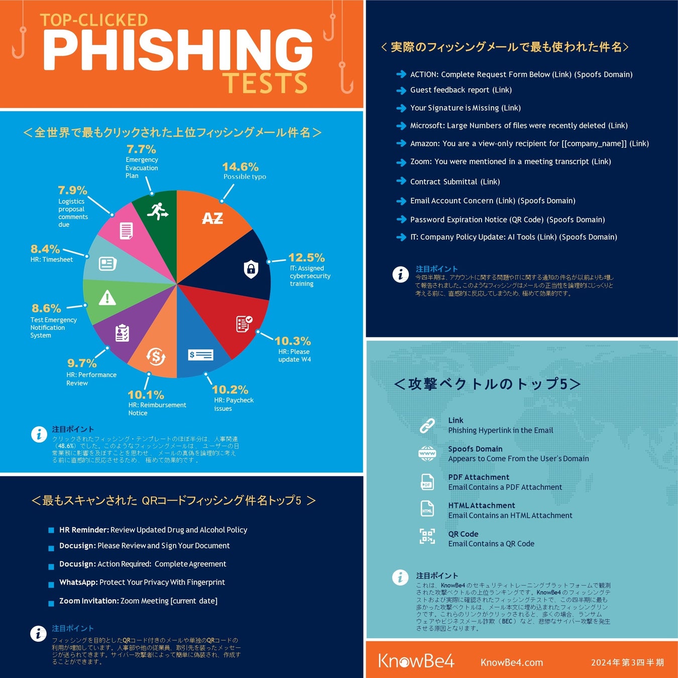 米国フロリダ州タンパベイ(2024年12月3日発)/東京(2024年12月9日発)- 統合型セキュリティ意識向上トレーニングとヒューマンリスク管理で世界をリードするサイバーセキュリティ・プラットフォームのプロバイダーであるKnowBe4(本社:米国フロリダ州タンパベイ、創立者兼CEO:Stu Sjouwerman (ストゥ・シャワーマン))は、2024年度第3四半期(2024年7月~9月)フィッシングレポートを公開して、最新のフィッシング動向を発表しました。本レポートでは、フィッシングテストで最も多くクリックされたメールの件名を分析していますが、第3四半期の結果では人事およびIT関連のフィッシングが引き続き多くの従業員の関心を惹きやすいことが明らかにされています。