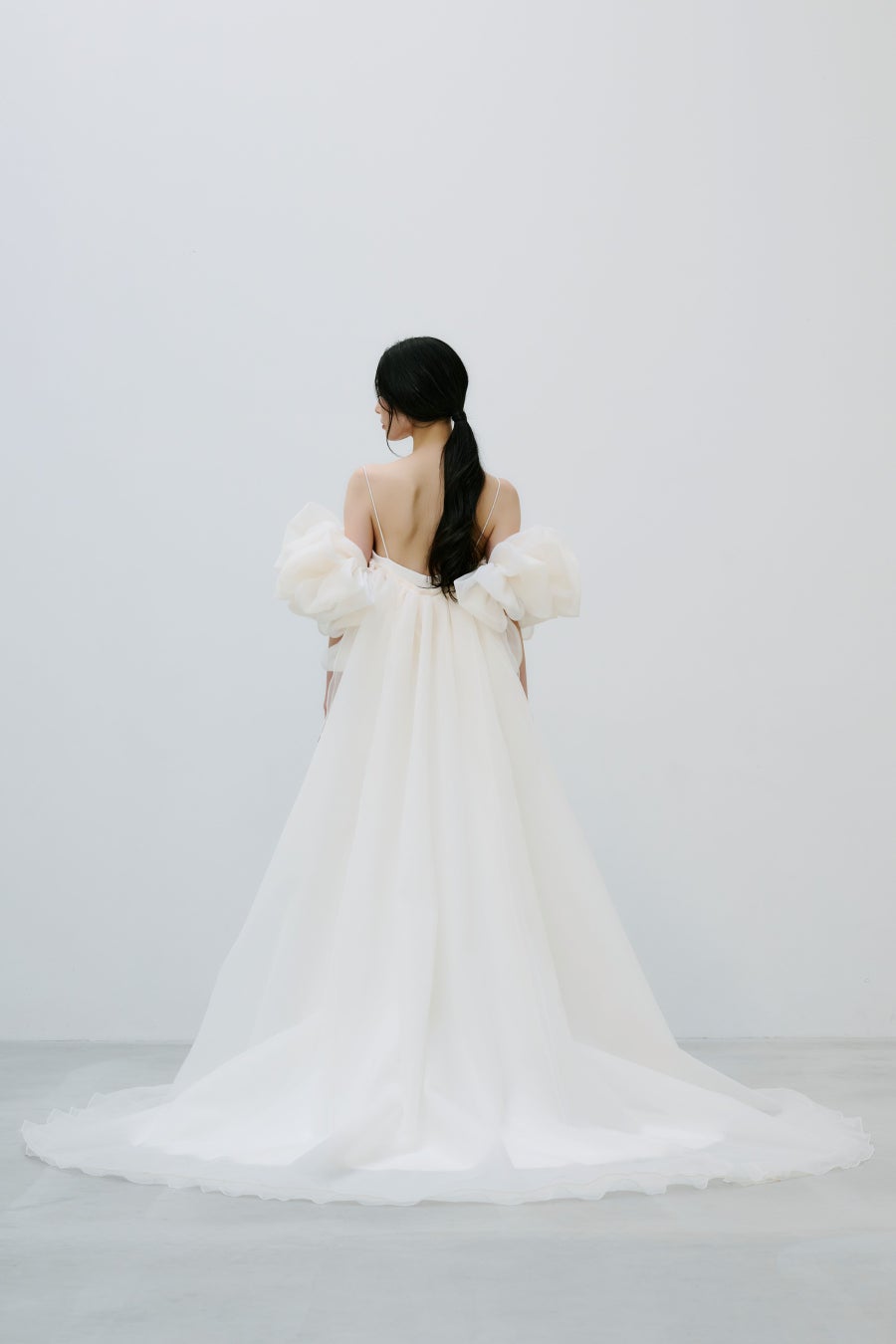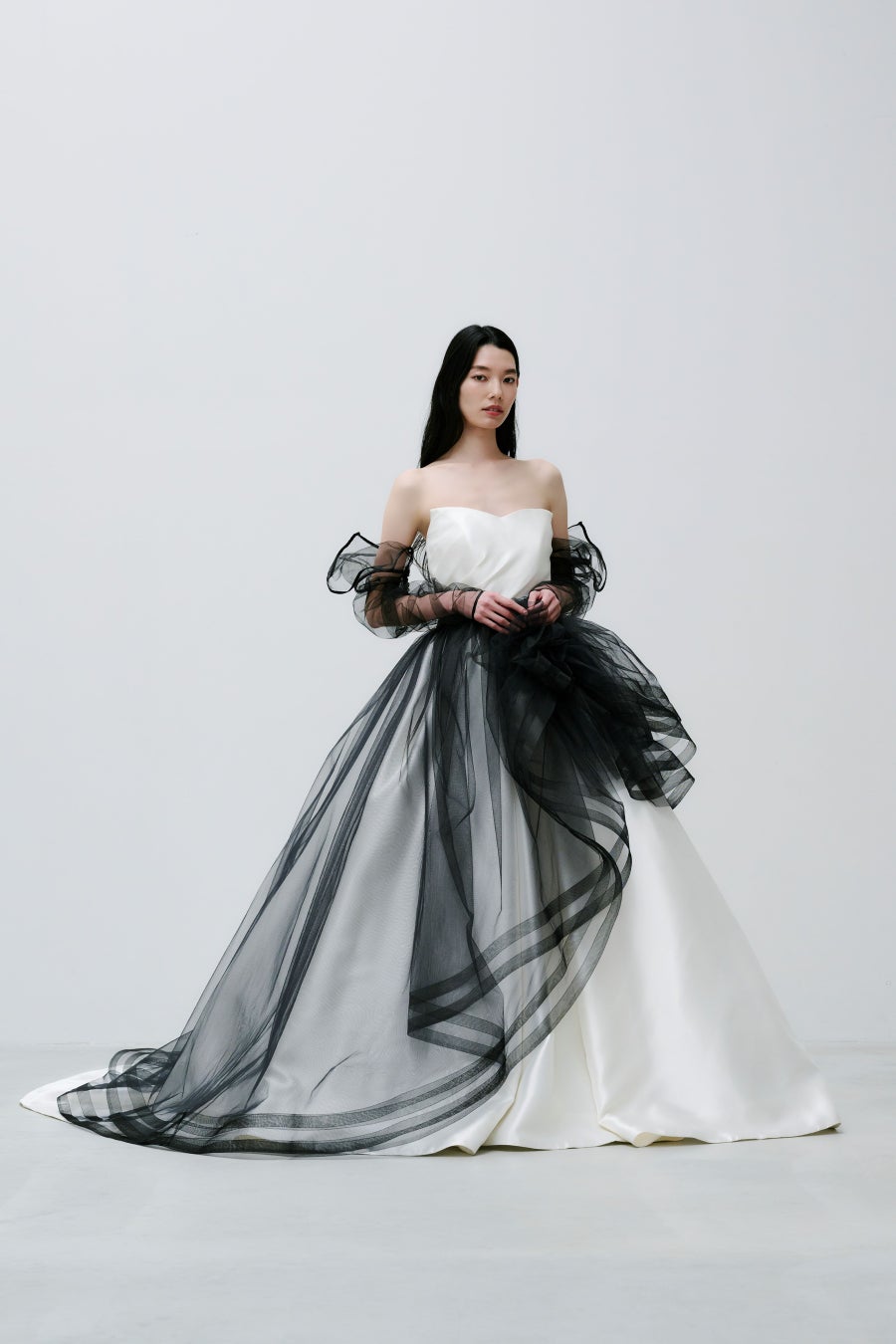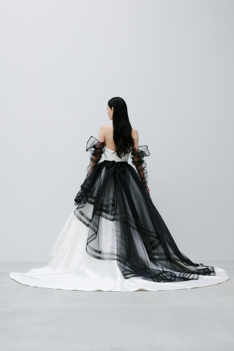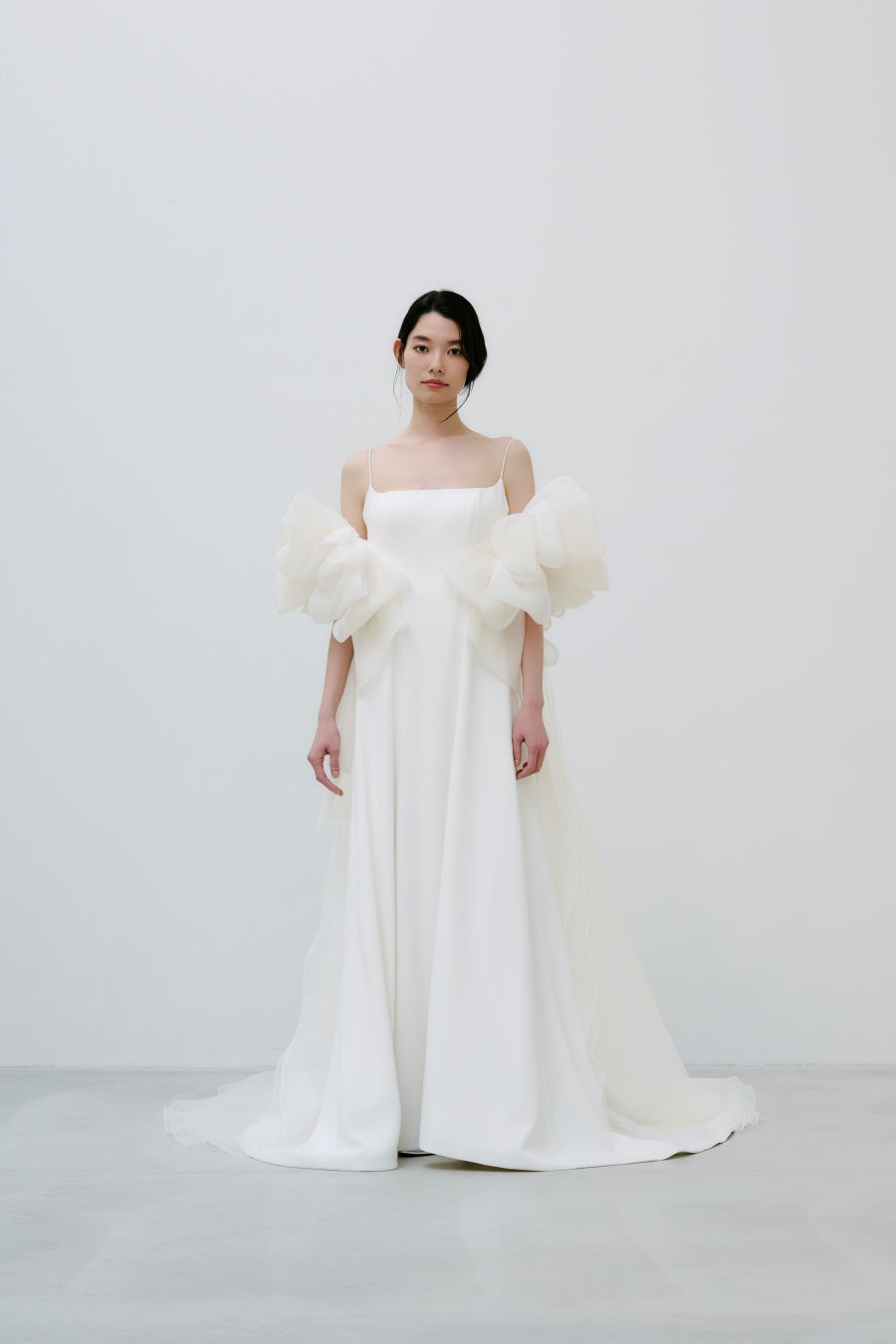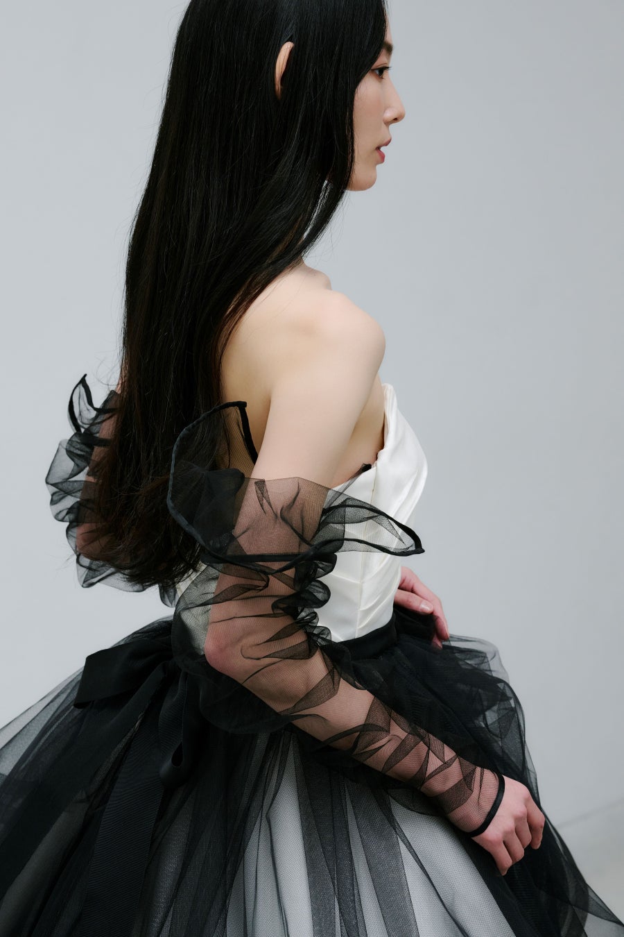 上質な薄ミカド生地を使用し、光沢感とハリのある美しいシルエットを実現したボリュームドレス。キャットアイネックのビスチェと、ウエストに施した放射線状のドレープが花嫁のスタイルを引き立てます。また、バックスタイルを印象的に彩る取り外し可能なアシメトリーデザインのリボンをそなえ、ブラックの付属アイテムをなくしても完成されています。ブラックチュールのオーバーサイズスリーブやオーバースカートを組み合わせることで、クラシカルなミカドドレスにエッジを効かせたスタイルへアレンジ可能。素材の透け感や、オーバースカートにトリミングされたホースヘアの描く曲線が透明感をプラスし、軽やかさを演出します。伝統とモダンが融合した、洗練された一着です。