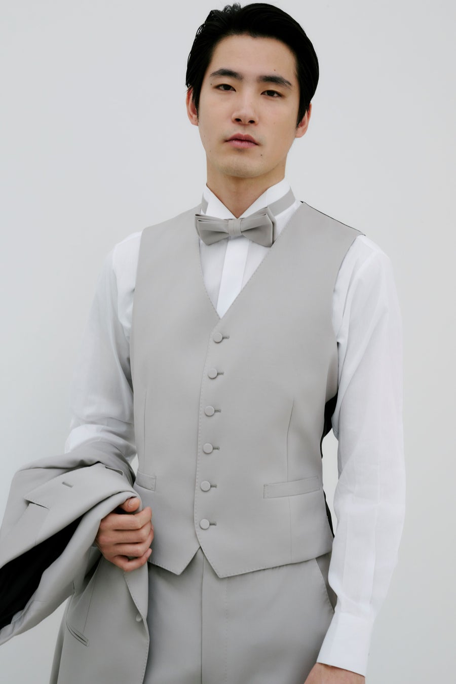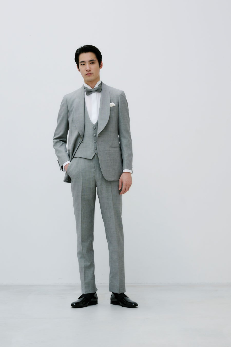 柔らかな肌触りと美しい発色が特徴で、上品なグレーカラーがエレガントな雰囲気を演出します。デザインはショールカラーがクラシックな印象を与え、胸元がややラウンドした4つボタンベストが洗練されたアクセントに。格式のあるフォーマルシーンにふさわしい、気品あふれる一着です。