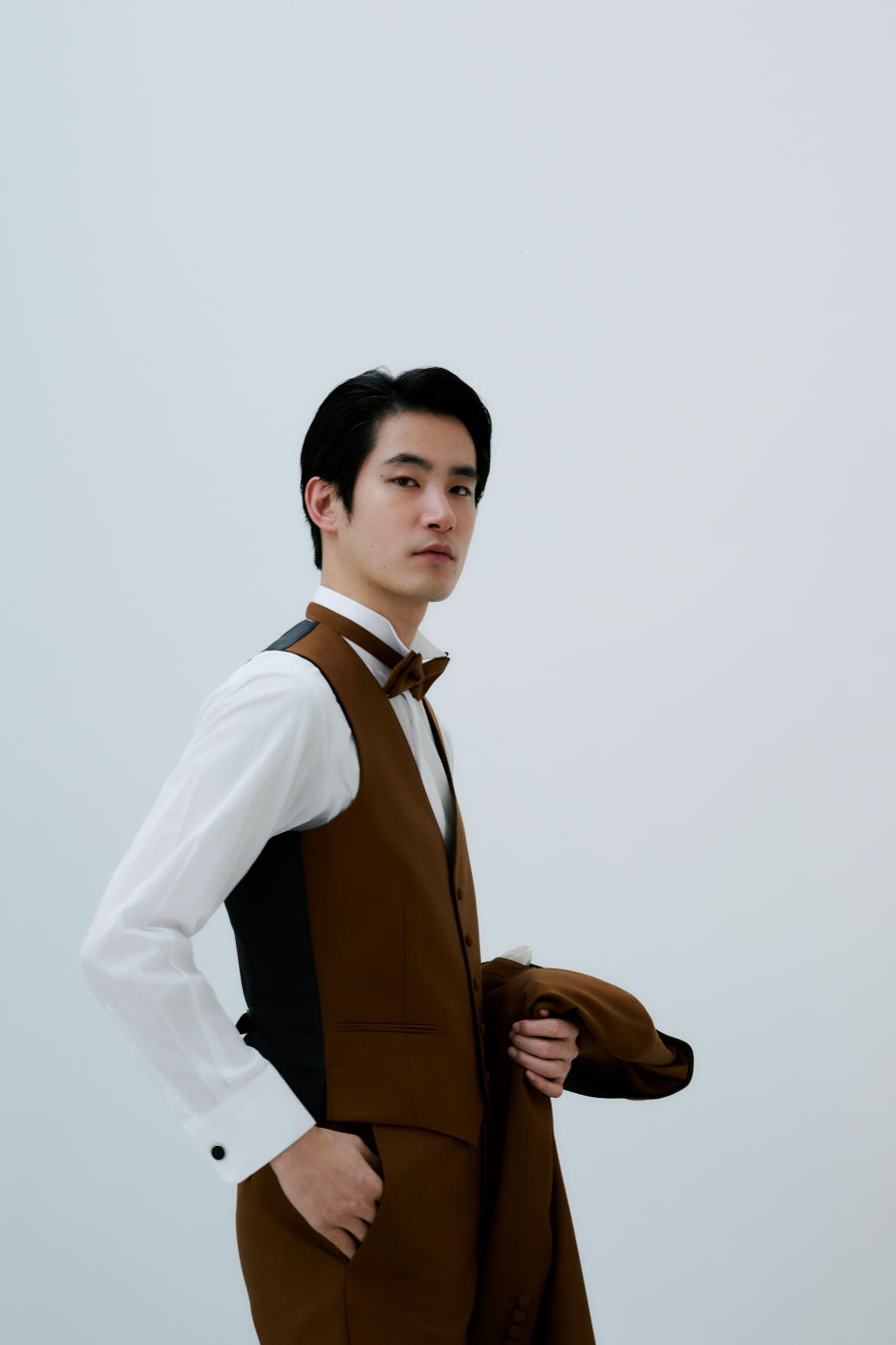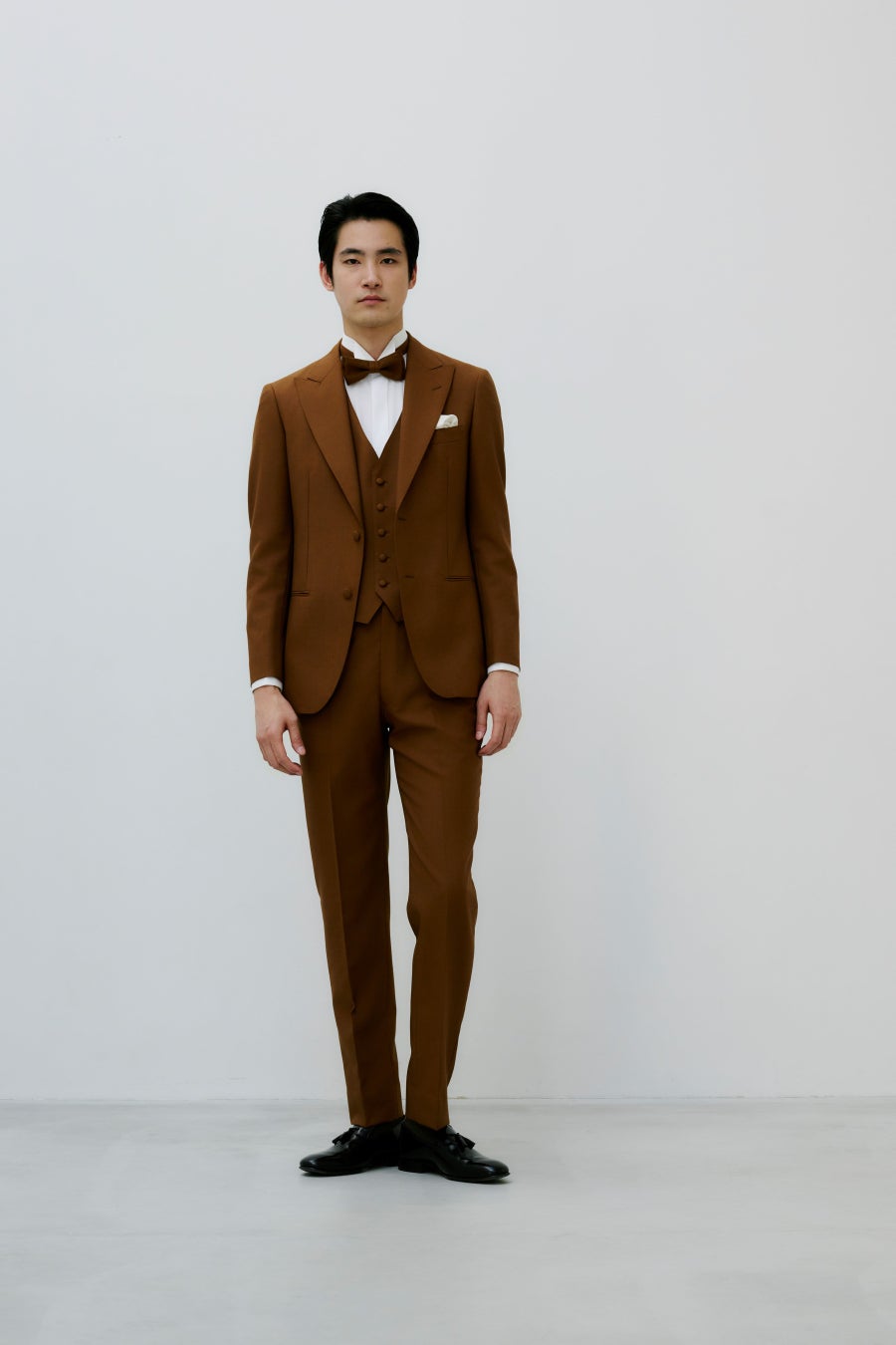 イタリア最大規模の老舗生地メーカーMarzotto(マルゾット)の高品質な生地を使用したフォーマルタキシード。クラシックからトレンドまで多彩な表現力を持つ生地が、洗練されたスタイルを演出します。ピークドラペルがエレガントな印象を与え、上品且つカジュアルな雰囲気も兼ね備えた明るいブラウンカラーが特徴的。披露宴やパーティーシーンにぴったりな、華やかで洗練された一着です。