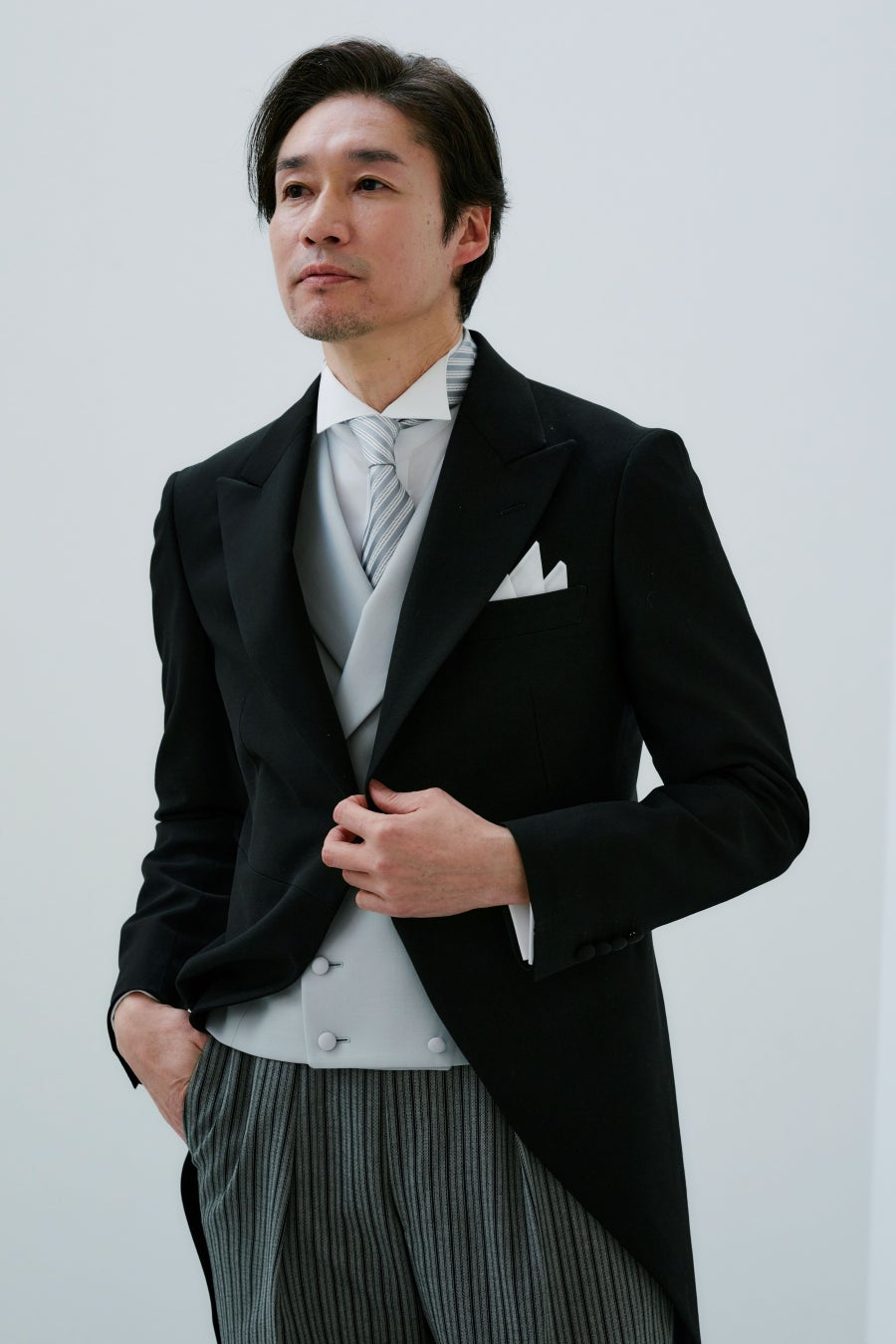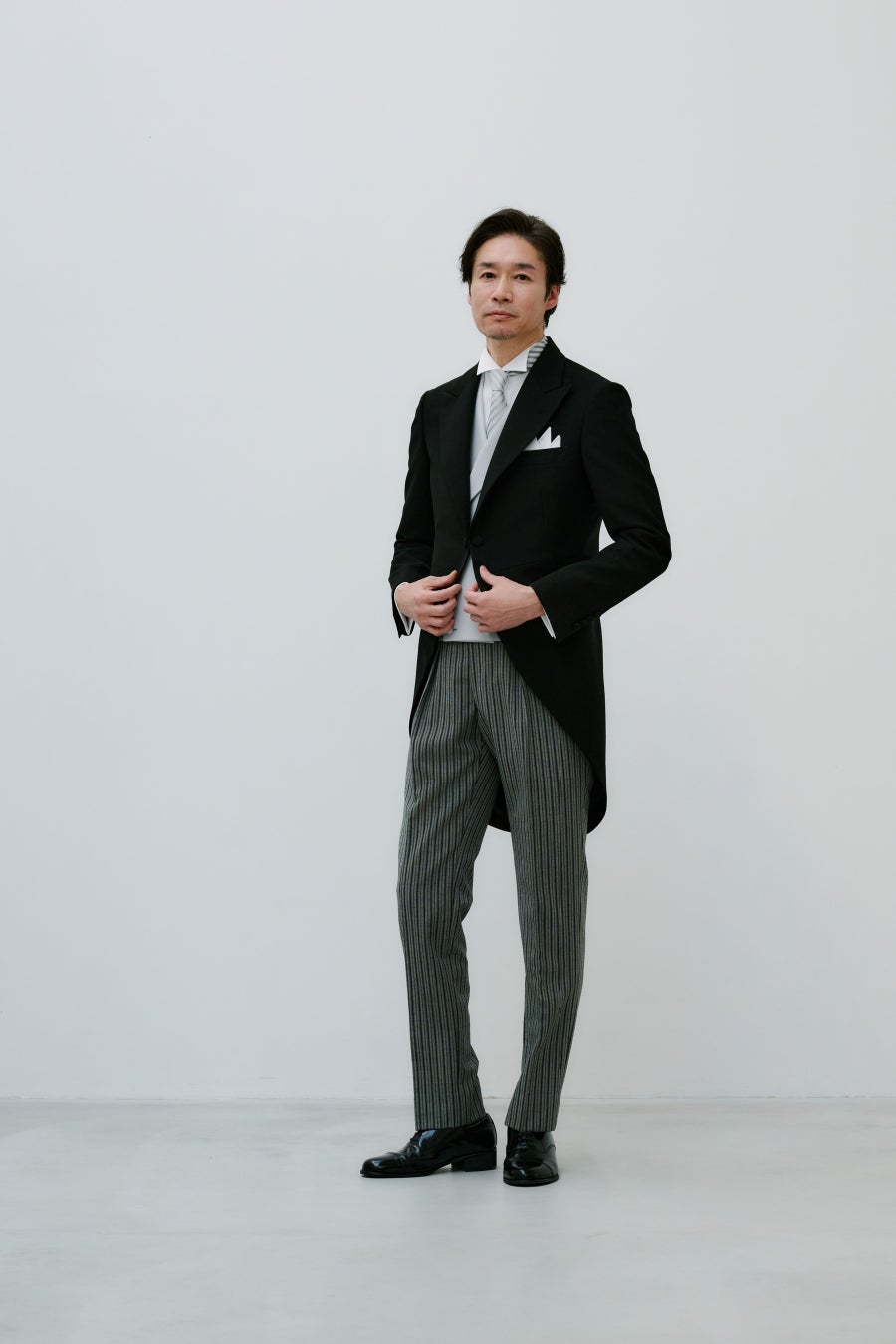 深みのあるブラックが特徴の国産ウールを使用した、格式高い列席者用モーニング。