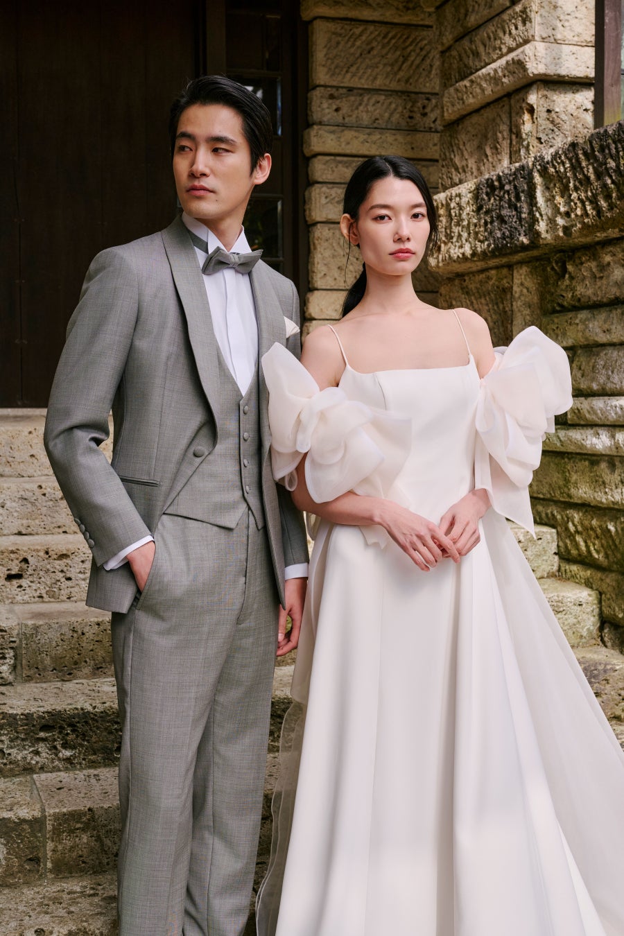 今回、初の「ウエディングドレスと列席者用のモーニング」が新たに加わることで、お客様ご自身のお好みや個性だけでなくご親族を含むトータルコーディネートを実現。ウエディングドレスは、伝統的なクチュールの技術を残す現代のメゾンブランドのような雰囲気を重視し、ファッション性の高いデザインを採用。着脱可能なパーツを取り入れエレガントさとモダンさを融合させた2デザインをご用意しました。また、ユナイテッドアローズが監修し、制作したフォーマルタキシード3デザインと、列席者用モーニング1デザインは、「モダンクラシックスタイル」というコンセプトに基づき、フォーマルなディテールの中に、新しいスタイルを構築。ユナイテッドアローズの“トラッドマインド”を活かし、伝統的要素をモダンに解釈した「ショールカラー」や「ピークドラペル」が、洗練された印象を与えます。