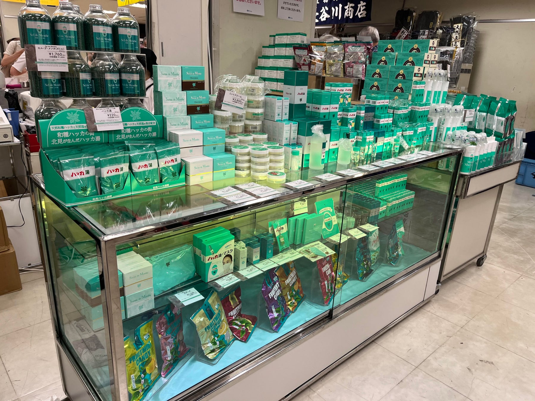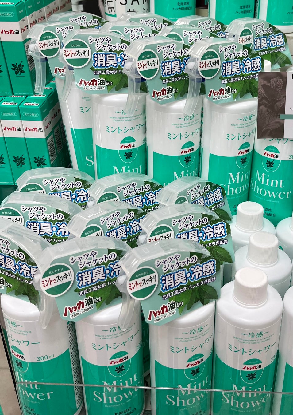 ハッカ草から蒸留抽出した天然オイルを使用したアイテムが幅広くそろう「北見ハッカ通商」。今夏、北海道でも猛暑が続くことから人気が高まっている衣類にかける冷感スプレー「ミントシャワー」は、例年の2倍の在庫を確保して展開。そのほかにも、天然ハッカならではのオールシーズン使用できるバスソルトなどがそろいます。