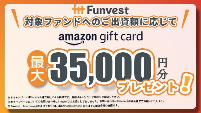 本ファンドへ出資していただいた投資家の皆様を対象として、出資額に応じて最大35,000円分のAmazonギフトカードをプレゼントするキャンペーンも併せて実施いたします。