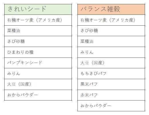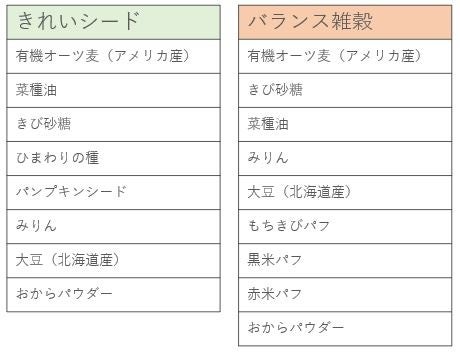 <きれいシード>有機オーツ麦(アメリカ産)、菜種油、きび砂糖、ひまわりの種、パンプキンシード、みりん、大豆(北海道産)、おからパウダー、(一部に大豆を含む)
