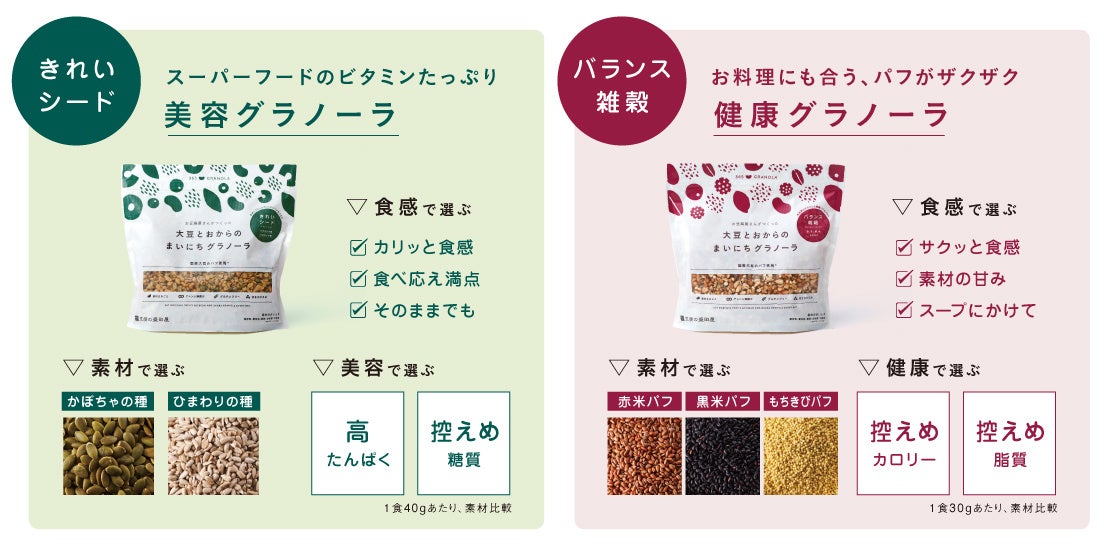 大豆食品のヘルシー新習慣! お豆腐屋さんがつくった“大豆”と“おから”のまいにちグラノーラが美容と健康を軸に2種同時発売!
