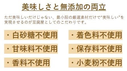 原材料は10個以下。余計なものは使わず素材の良さを活かす、豆腐作りの魂を込めたものづくり。