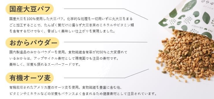 主原料となる素材は、国産大豆パフ×おからパウダー×オートミール。