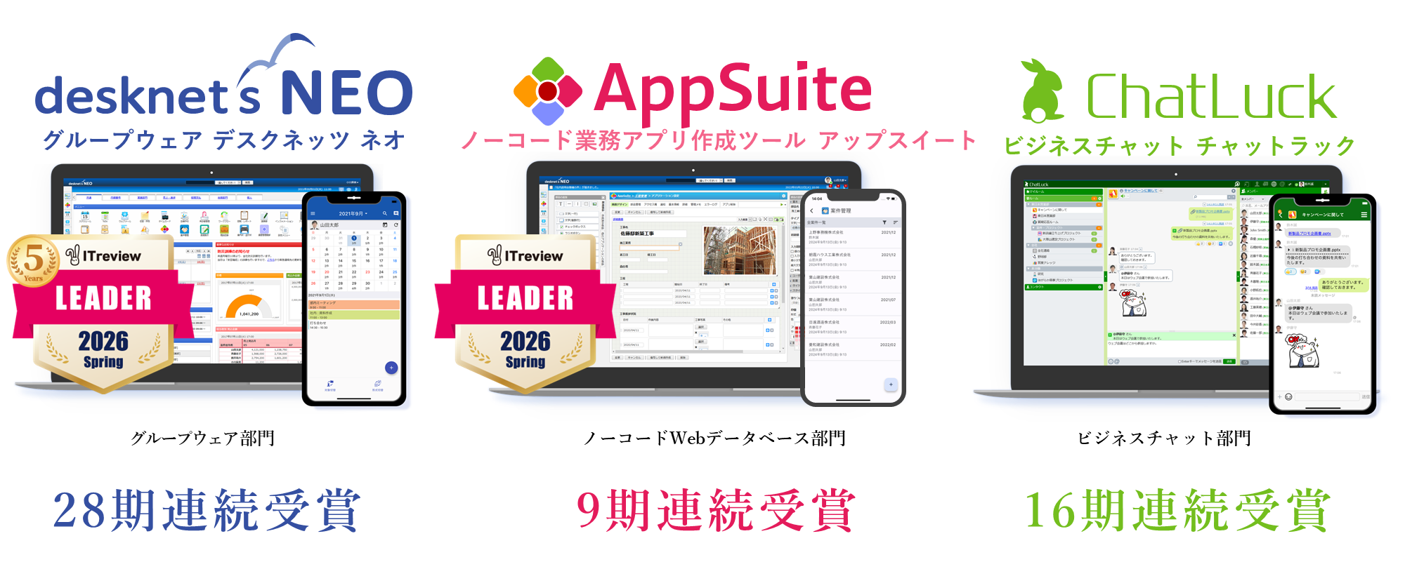 株式会社ネオジャパン(本社:神奈川県横浜市、代表取締役社長:齋藤 晶議)は、アイティクラウド株式会社(本社:東京都港区、代表取締役社長:黒野 源太)運営のIT製品比較・レビューサイト「ITreview」が主催する「ITreview Grid Award 2026 Spring」においてグループウェア『desknet's NEO』、ノーコード業務アプリ作成ツール『AppSuite』、ビジネスチャット『ChatLuck』が、それぞれ5部門で最高位である「Leader」を受賞したことをお知らせします。グループウェア『desknet's NEO』は、グループウェア部門で28期連続での受賞となり、その使いやすさと顧客満足度の高さが評価されています。