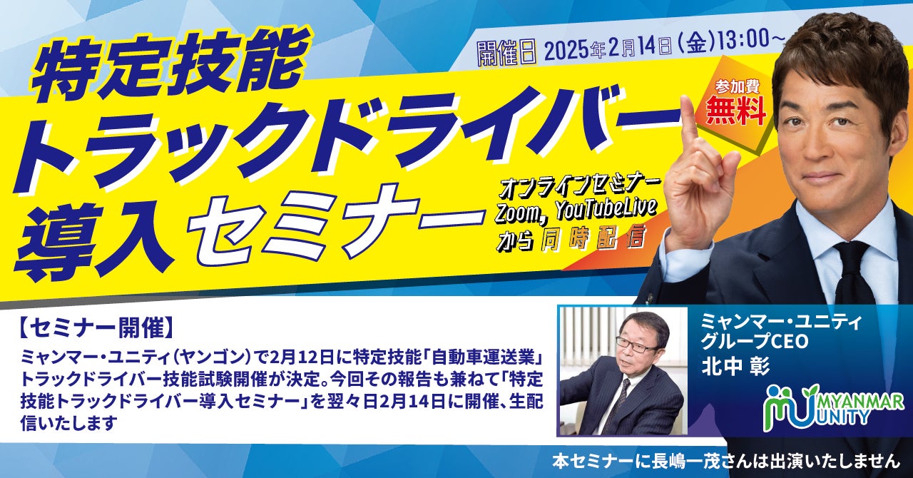 「ミャンマー・ユニティ」は、2月14日(金)に開催した「特定技能トラックドライバー導入セミナー」の動画を無料公開いたします。