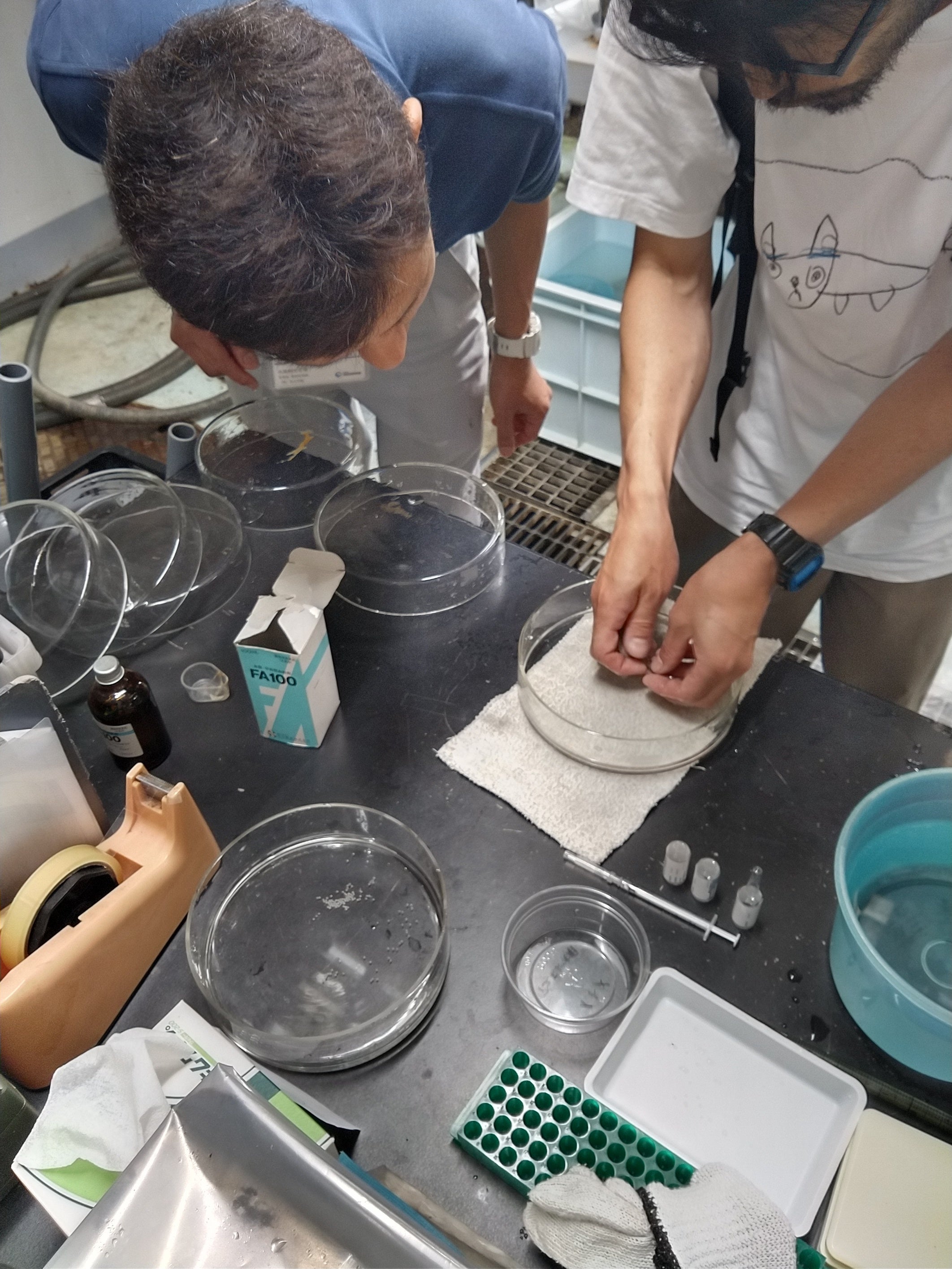 写真 左:京都水族館への繁殖作業の技術指導の様子(2024年6月撮影)