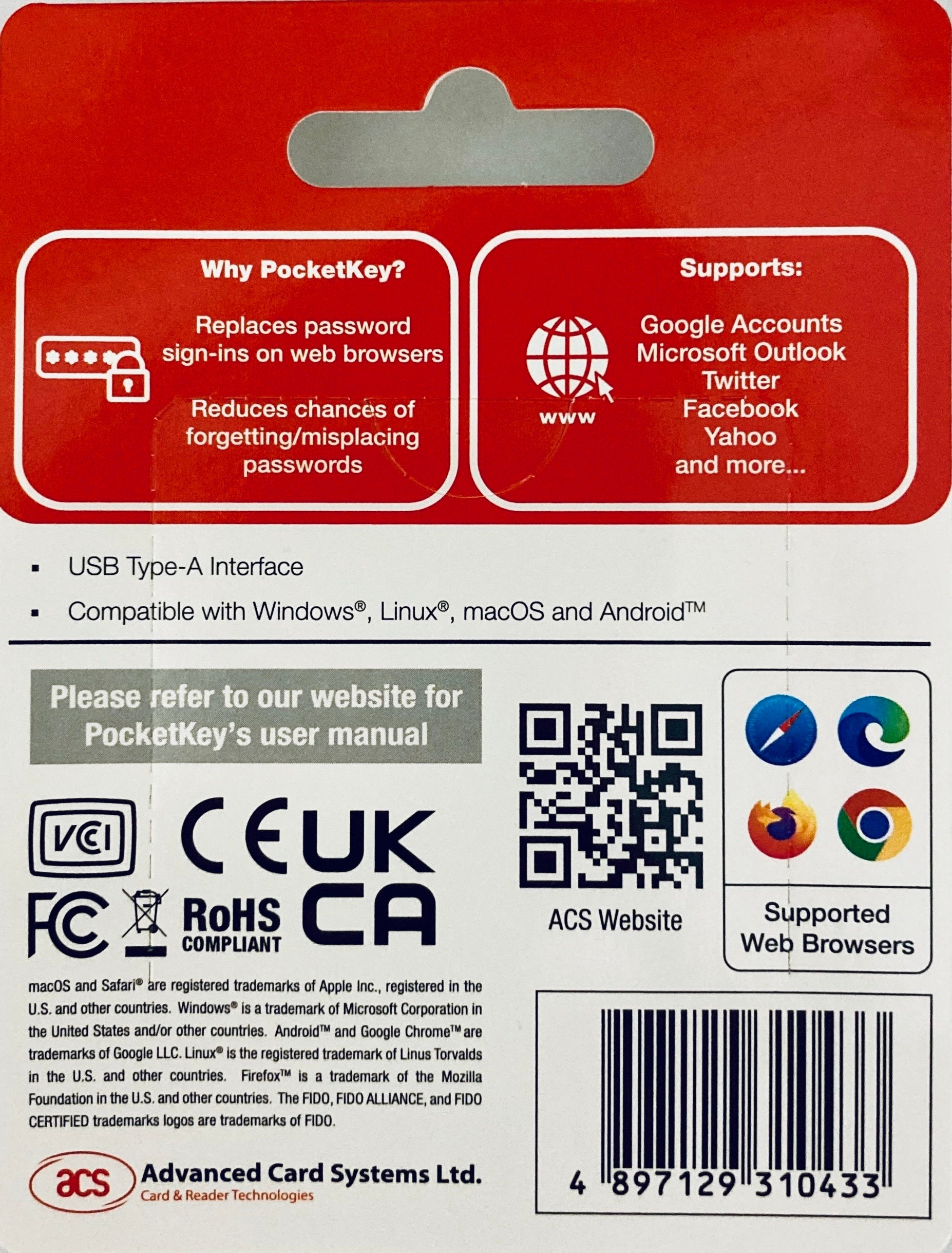 ACSのポケットキーは、ユーザーに安全で迅速なパスワードレスオンラインログインの体験することが実現します。 ポケットキーより、個人、企業、および政府などの機関がパスワードを多要素認証または 2要素認証を置き換えることができ、スタティックパスワードへの依存性を減らすことができます。