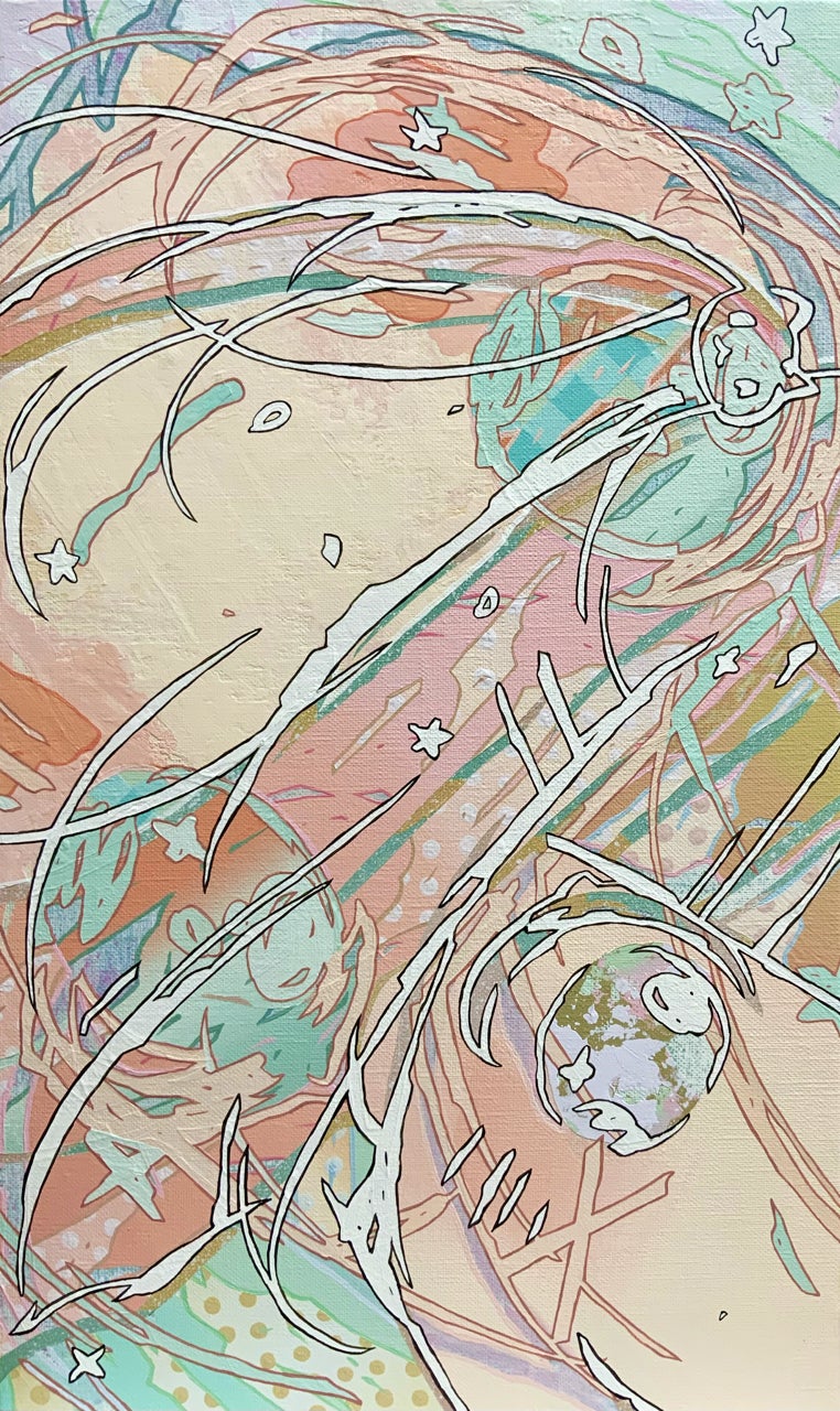 作品制作の根底には幼少期に描き続けていた少女漫画があるといいます。作品に描かれる少女たちは、どこかに野澤自身の投影もあり、また彼女の身近に起こる小さな物語たちを複数のレイヤーで描きこむこともあるといいます。野澤の作品は、カレイドスコープのように見る者の視線や視点によって全く表情を変えて映り、また鏡の館に迷い込んでしまった際に捉えられる遠近感に弄ばれているにも似た感覚を私たちに与えます。実作品をご覧いただき、時間軸を超えて、かわいさの中で繰り広げされる錯乱に惑わされることを楽しんでいただけますと幸いです。