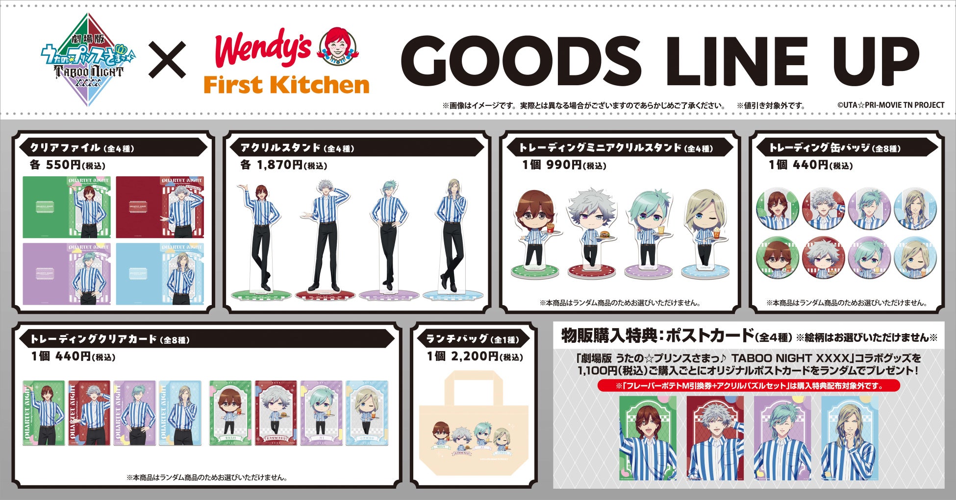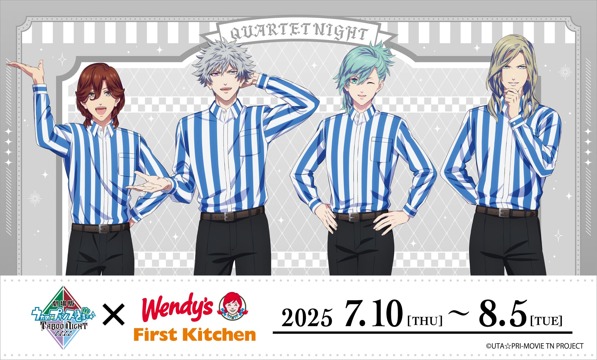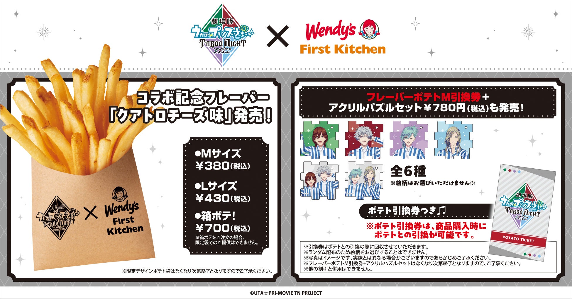 ウェンディーズ・ジャパン株式会社及び、ファーストキッチン株式会社(所在地:東京都新宿区、代表取締役:紫関修)は7月10日(木)より、ウェンディーズ・ ファーストキッチンとファーストキッチン(競馬場店を除く)で、映画『劇場版 うたの☆プリンスさまっ♪ TABOO NIGHT XXXX』とのコラボキャンペーンを開催します。コラボを記念して、QUARTET NIGHTのメンバーをイメージした「クアトロチーズ味」ポテトの販売、オリジナル描きおろしビジュアルを使用した、「フレーバーポテトM引換券+アクリルパズルセット(全6種)」780円(税込)を8月5日(火)までの期間中、数量限定で販売します。数に限りがありますのでお早めにご来店ください。また、5店舗限定でコラボメニュー、コラボグッズなど盛りだくさんの内容を実施します。ぜひ『劇場版 うたの☆プリンスさまっ♪ TABOO NIGHT XXXX』とのコラボレーションをお楽しみください。