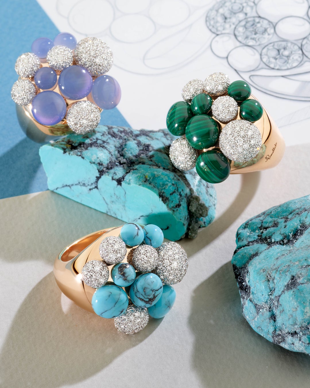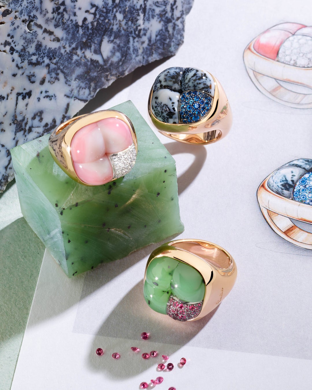 コレクションの核となるのは、ポメラートのシグネチャーであるカボションカットの再解釈と、そのなめらかでセンシュアルなフォルムへの敬意です。このジェムストーンのカッティングは、あらゆる形とサイズを追求した結果、ポメラートの個性的なスタイルの代名詞となり、遊び心がありながらも優雅なブランドの理念を象徴しています。