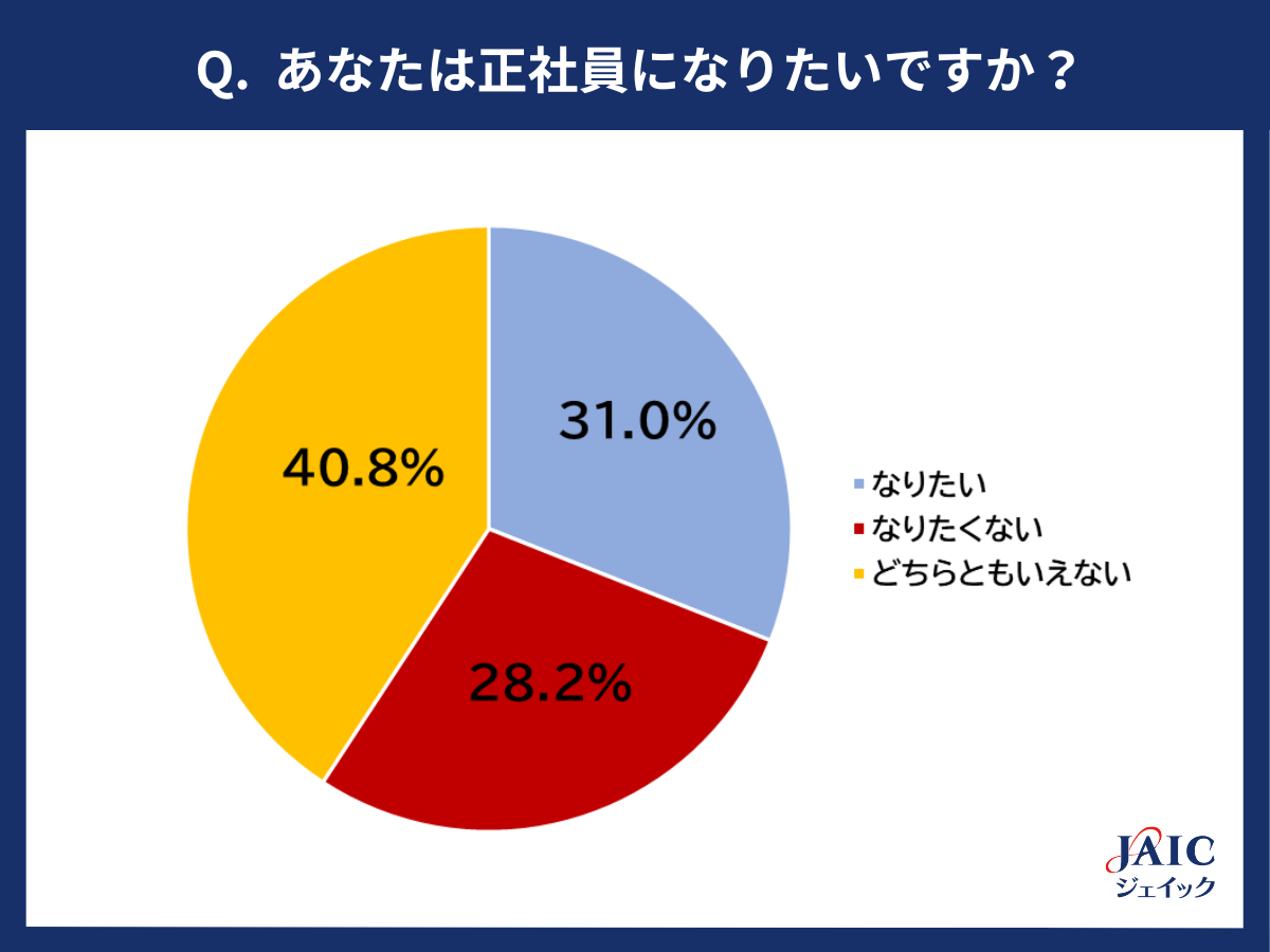 20代のフリーター・未就業者に「正社員になりたいですか?」と質問したところ、「なりたい」が 31.0%、「なりたくない」が28.2%、「どちらともいえない」が40.8%となりました。