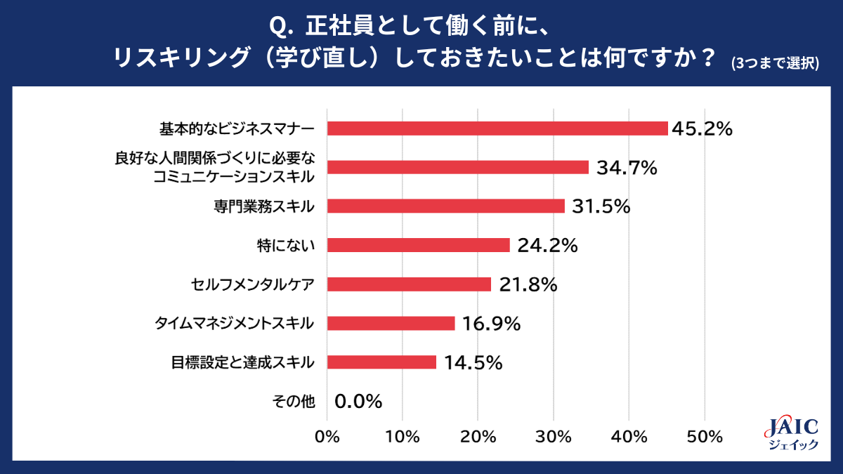 「正社員になりたい」と回答した方を対象に、「正社員として働く前に、リスキリング(学び直し)しておきたいことは何ですか?(3つまで選択可)」と質問したところ、1位「基本的なビジネスマナー(挨拶、メールの送り方など)」が45.2%。2位「良好な人間関係づくりに必要なコミュニケーションスキル」が34.7%、3位「専門業務スキル(営業、経理、IT、マーケティング等)」が31.5%となりました。