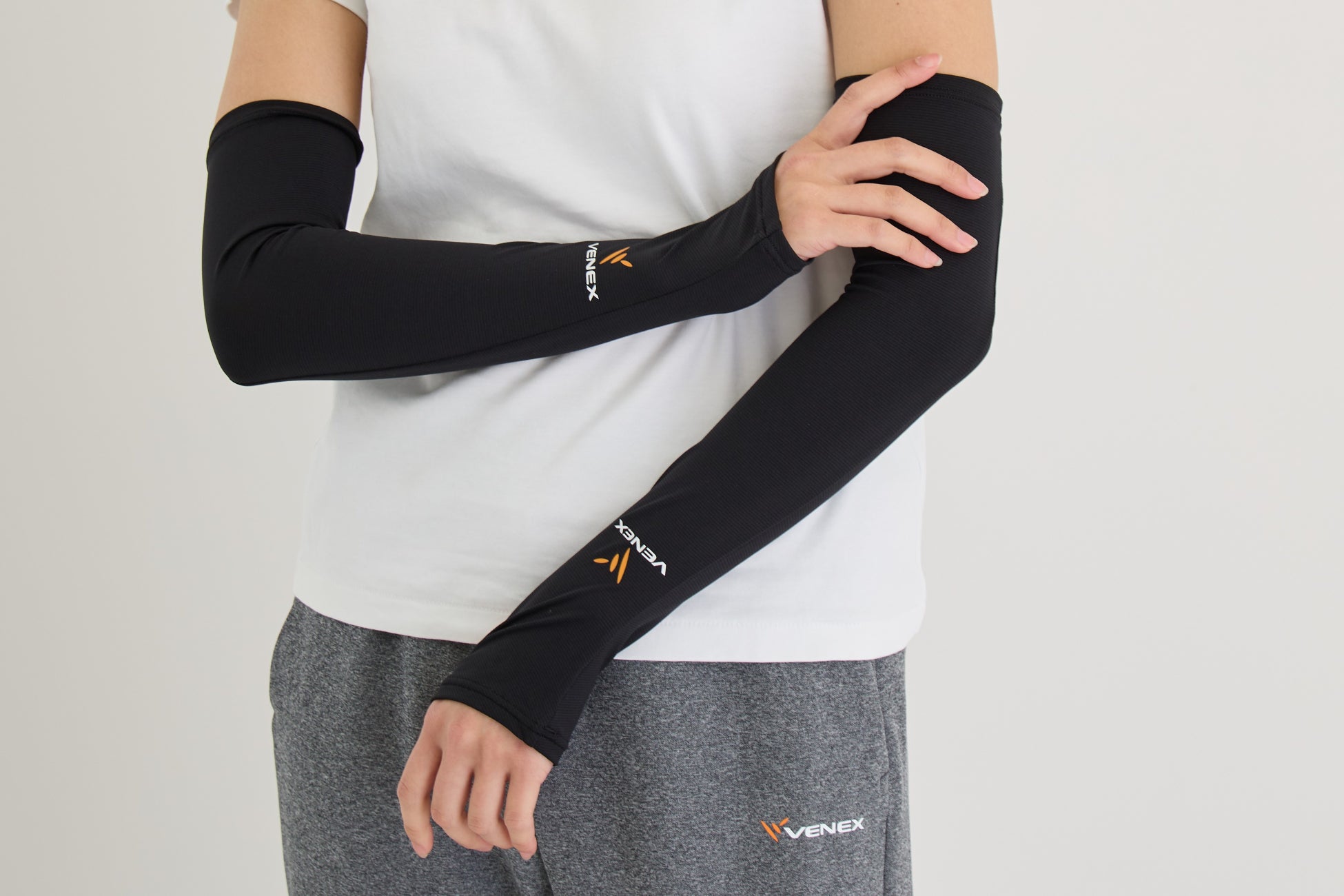 立体的なパターンが特徴で、腕に心地よくフィット。手から肘までを締め付けることなく程良く包み込むロングタイプのアームカバー。卓球で最も使われる体の部位の一つである腕のリカバリーなどにぴったりなアイテムです。