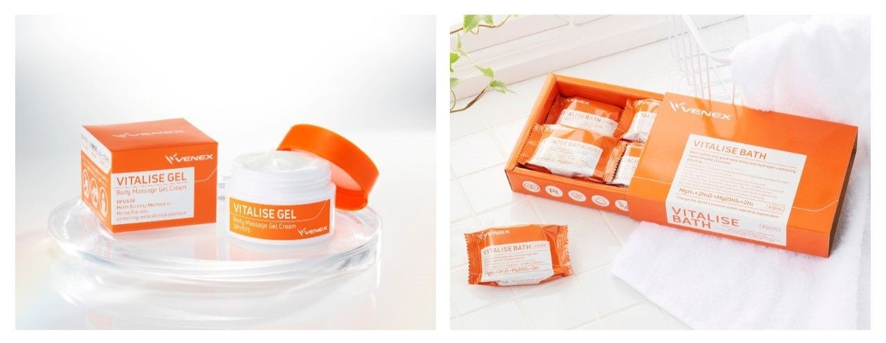 ベネクスが新たに提案する、お風呂上がりやマッサージの時に肌に塗布して使用する『VITALISE GEL(バイタライズゲル)』、体の冷えが気になったり、疲れを感じる時におすすめの入浴剤『VITALISE BATH(バイタライズバス)』の2種類。どちらの商品にも、ベネクスリカバリーウェアに使用しているプラチナをベースとした鉱物素材「DPV576(PHT繊維含有成分)」を配合し、その他の成分にもとことんこだわっています。日常使いはもちろん遠征時や試合前後などのリカバリーに取り入れていただけます。