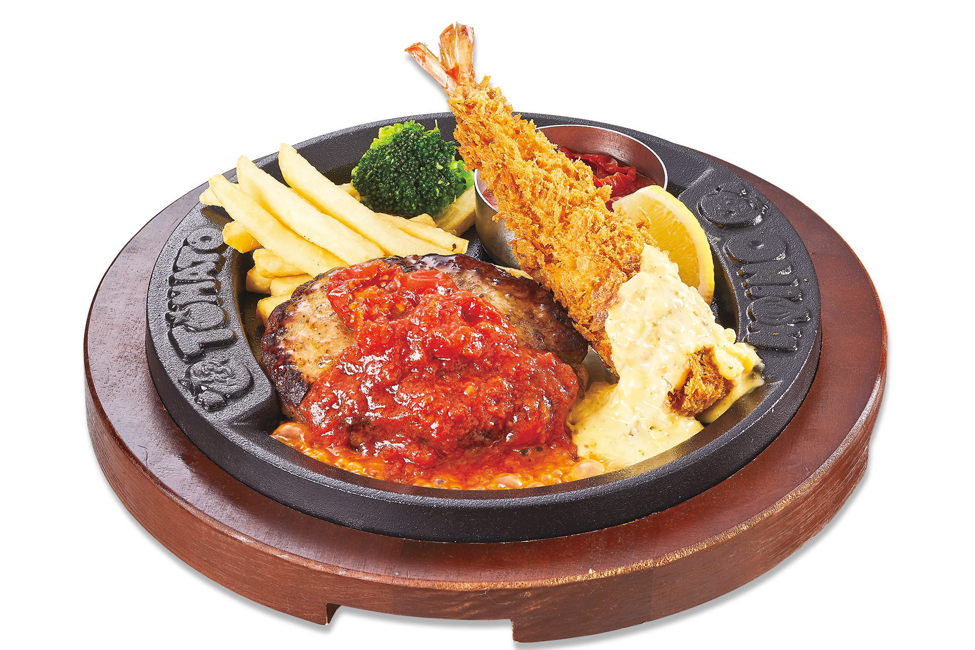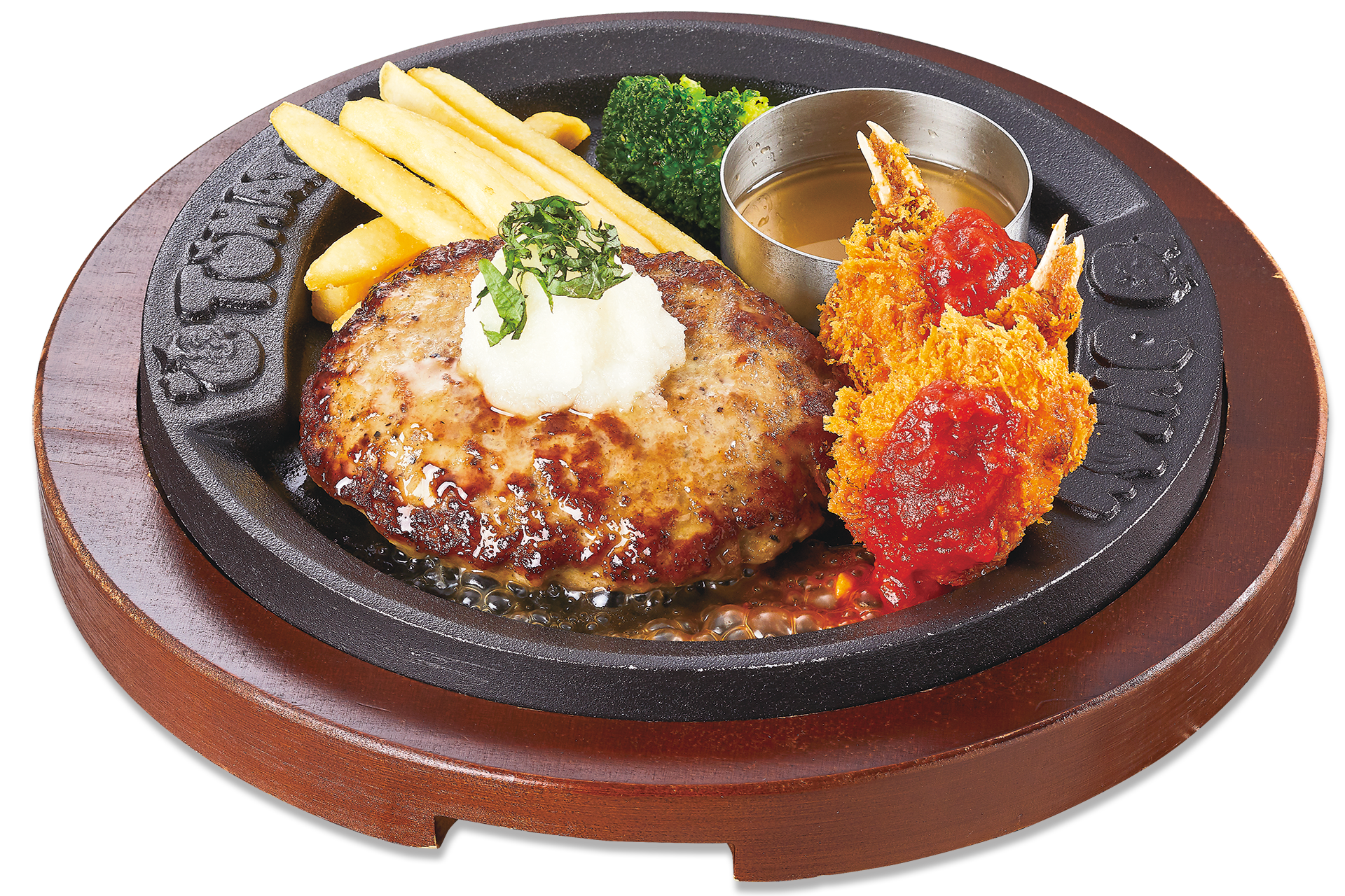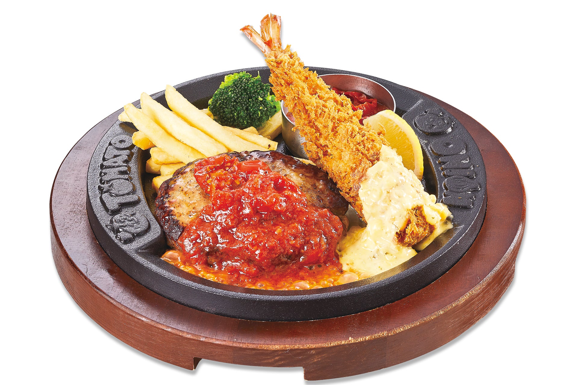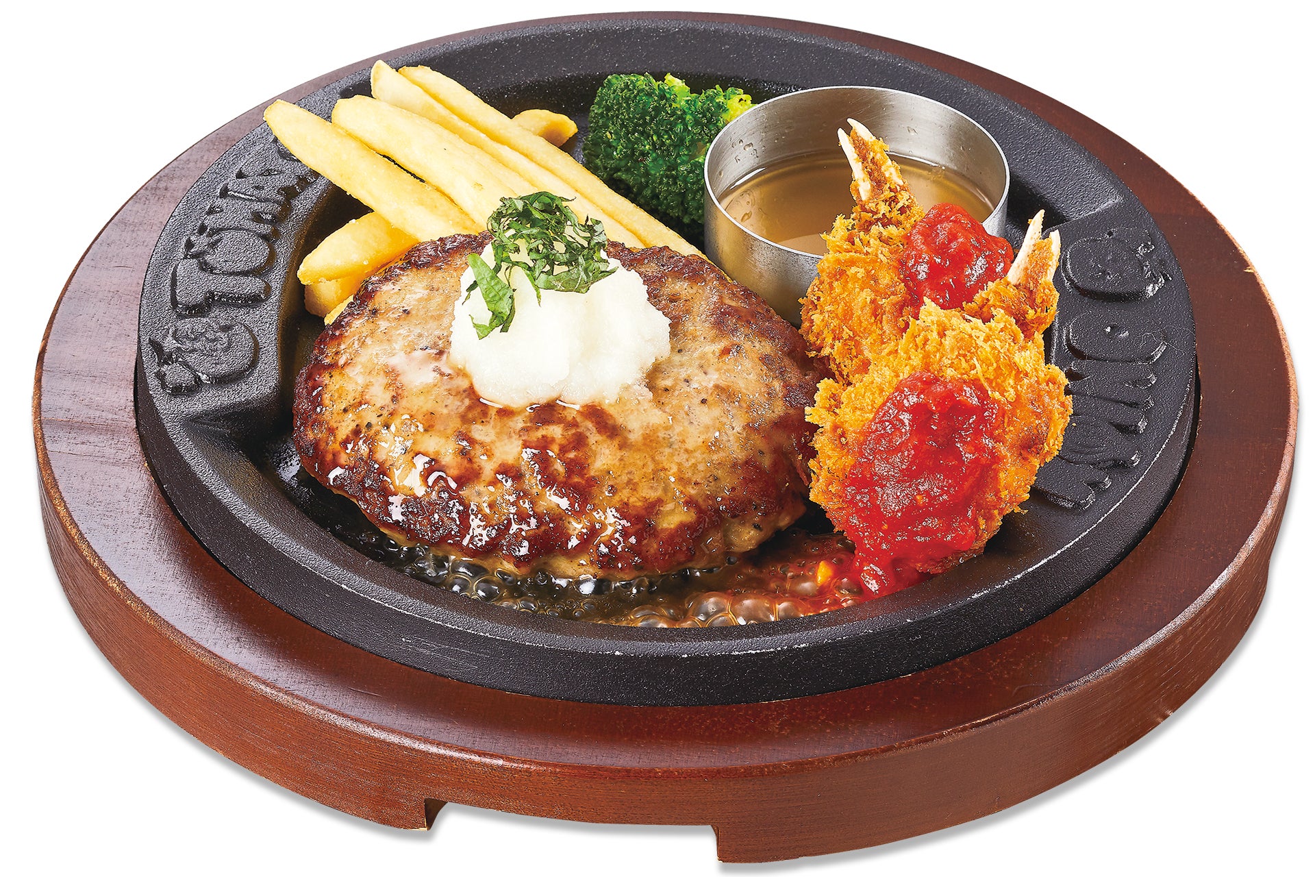 幸せのハンバーグと、全長約17cmのジャンボ海老フライを一緒に楽しめるコンビメニューです。
