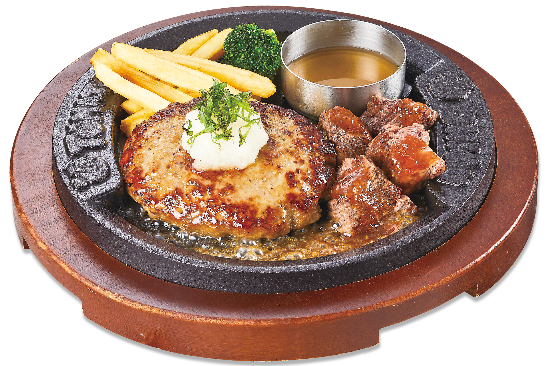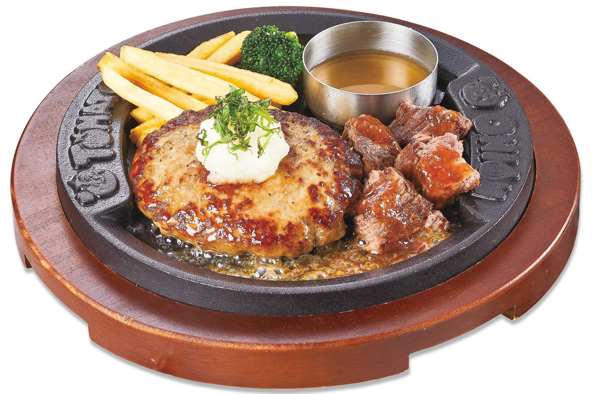 幸せのハンバーグと、赤身ステーキのビフテキを一緒に楽しめるコンビメニューです。
