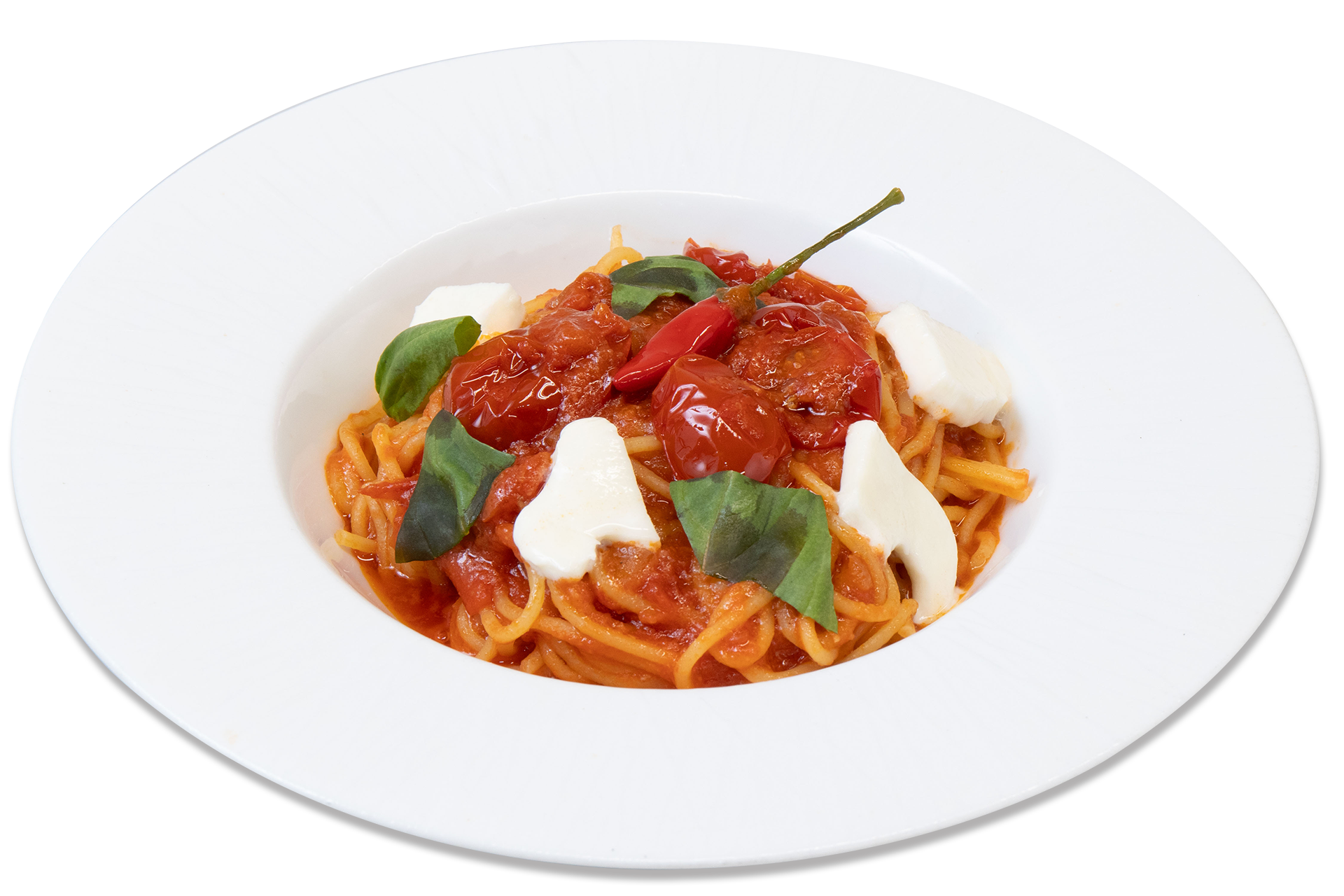 トマトの甘みと旨みが凝縮した王道パスタ。モッツアレラチーズがソースにコクを加えます。
