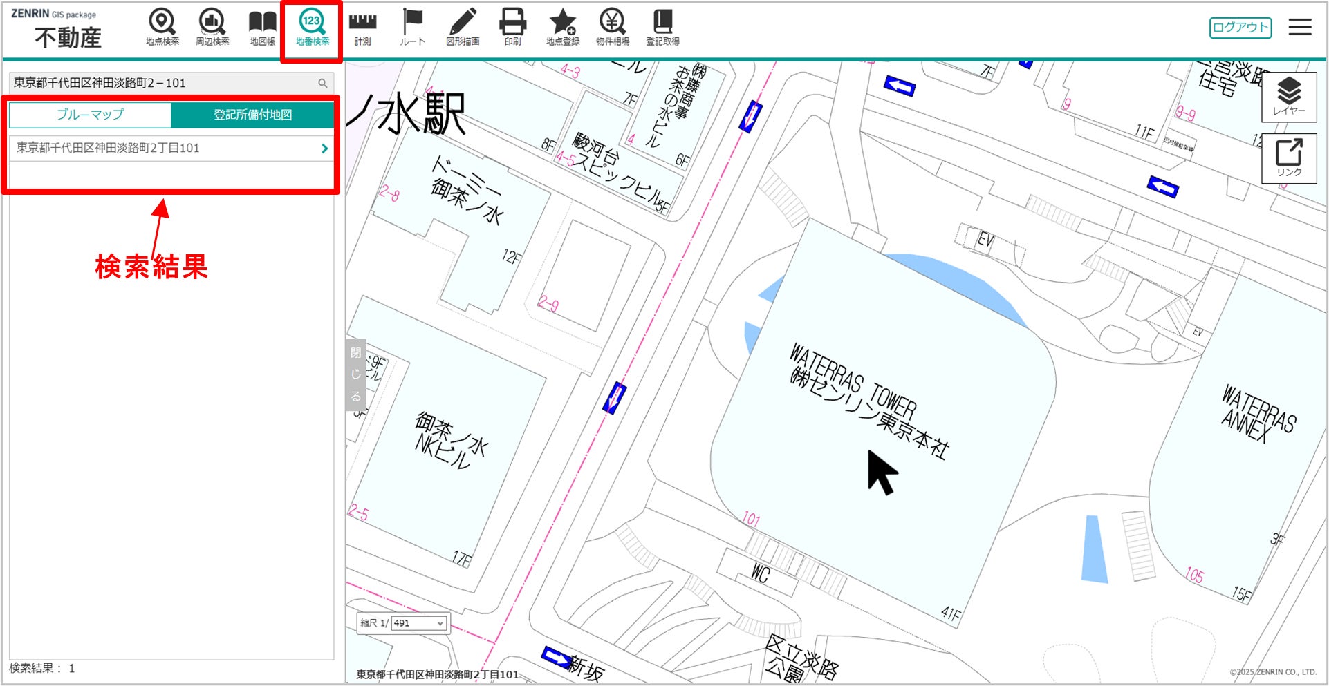 ●地番検索メニューからブルーマップ/登記所備地図の結果を表示できます。