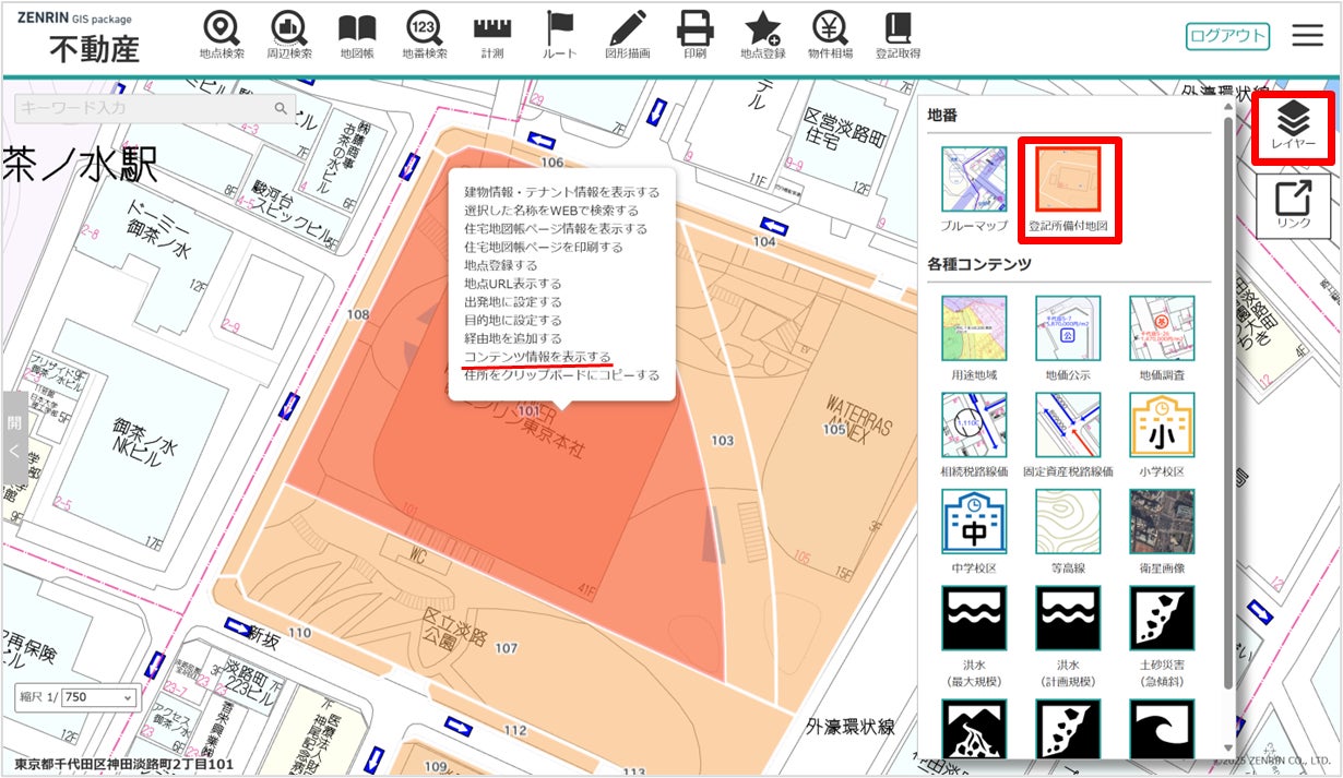 画面を右クリックし、「コンテンツ情報を表示する」を選択すると「登記所備付地図」情報を表示できます。