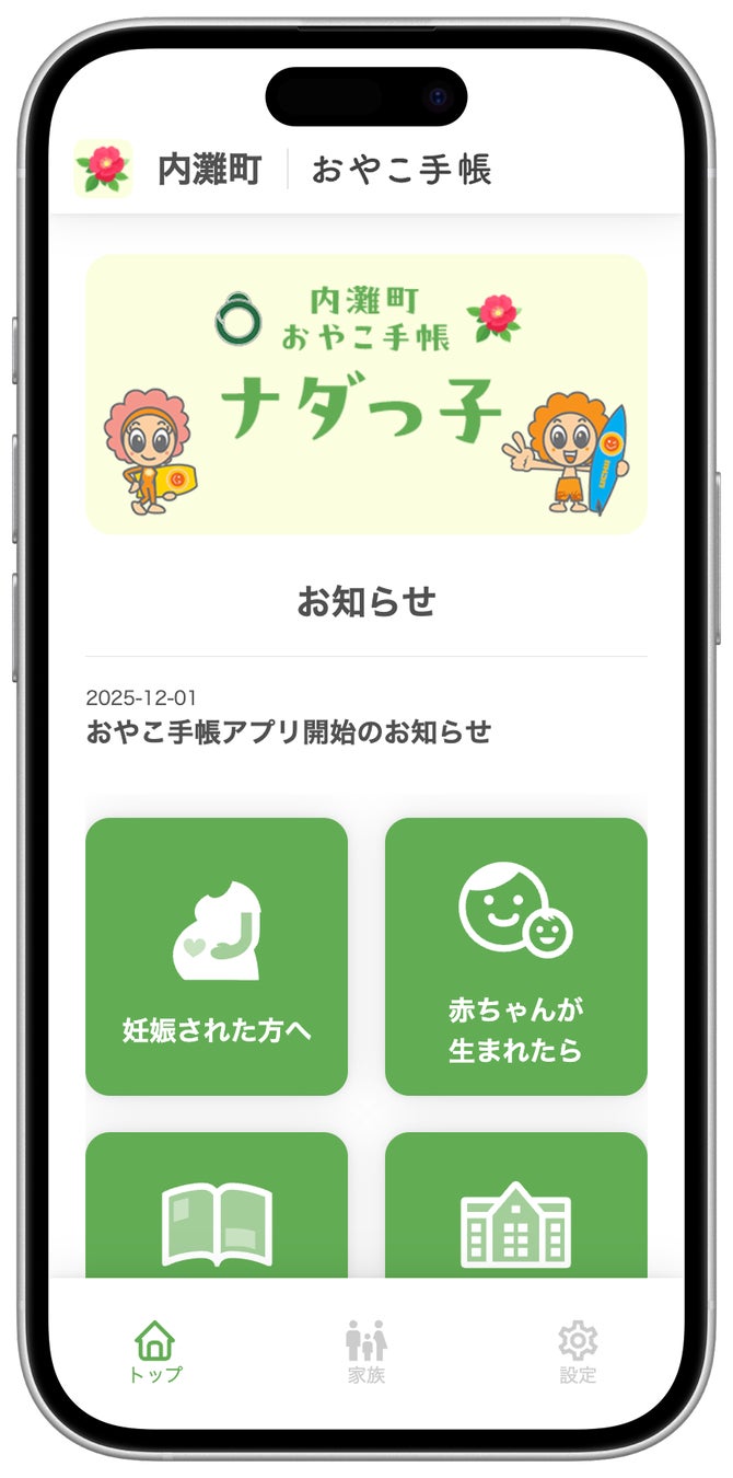 内灘町では、子ども・子育て支援事業計画の基本理念に「子育ち、親育ちを温かく見守り支える内灘づくり」を掲げ、すべての子どもが健やかに生まれ育ち、子育てしやすい環境づくりに努めております。このたび、妊娠期から子育て期までの切れ目ない支援の一環として「内灘町おやこ手帳 ナダっ子」アプリの運用を開始致しました。