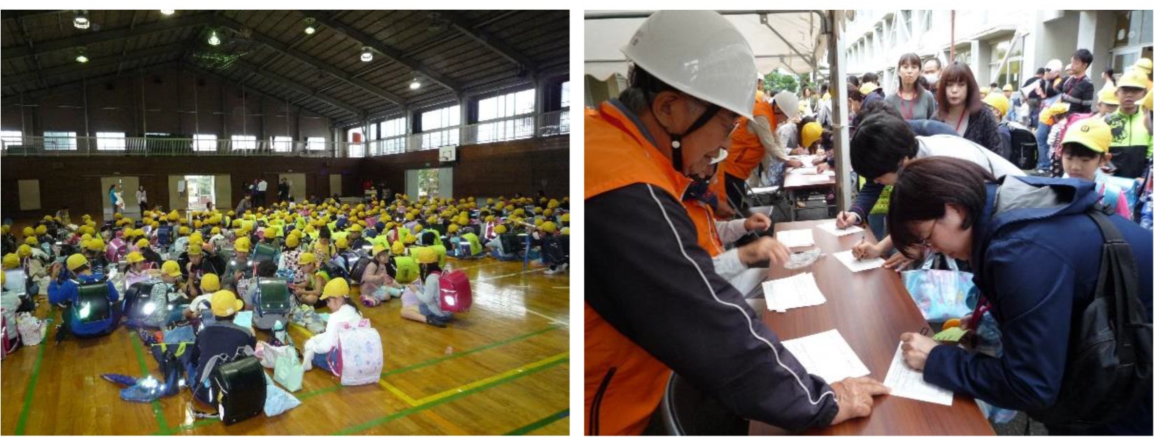 災害発生時を想定し、6年生がリーダーとして下級生を先導し、地元自治会長と一緒に校庭に設置した指定場所に避難したり、避難者名簿の作成やけが人の処置を行い、自治会ごとに所定の教室に避難場所移動するといった一連の流れを毎年繰り返し訓練することで、持続可能な災害対応システムを構築している。