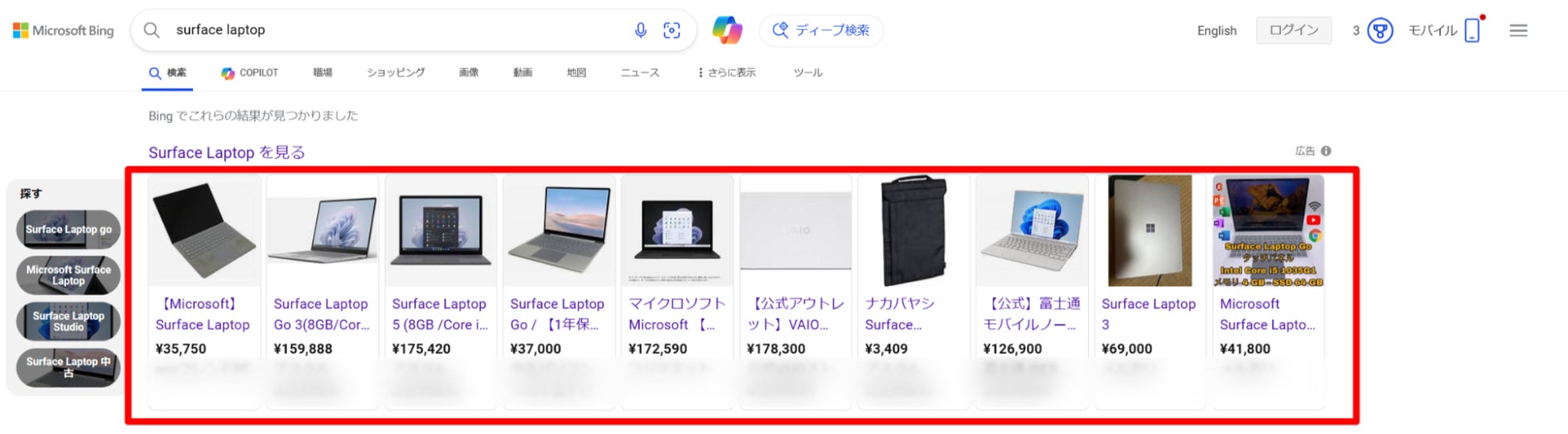 Microsoftショッピング広告は、マイクロソフトが提供する検索エンジン「Bing」の検索キーワードに連動して商品情報を表示する広告で、特に新規ユーザーの集客に長けています。商品の画像や価格、販売店名などの情報と共に、視認性の高い広告フォーマットで検索結果ページの上段に表示され、ユーザーの購買を促進します。