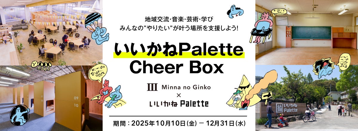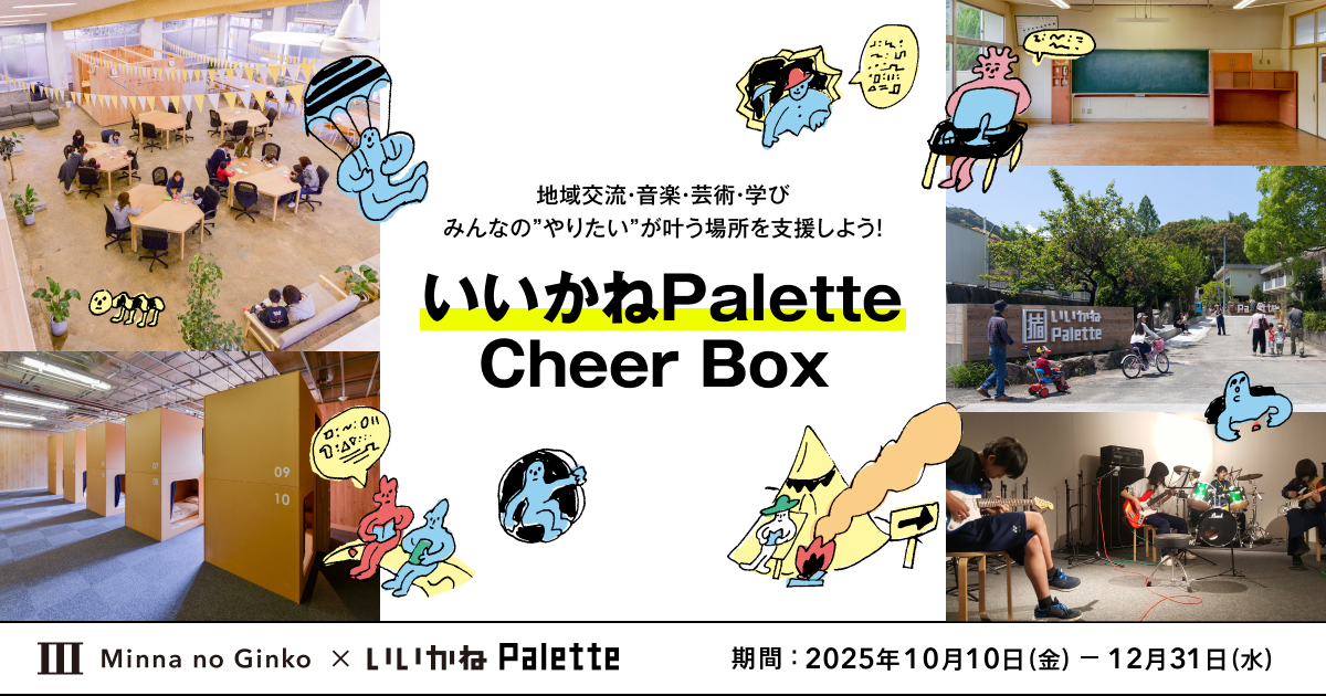 株式会社みんなの銀行(取締役頭取 永吉 健一、以下「みんなの銀行」)は、福岡県田川市の旧猪位金小学校の廃校を利活用し、地方創生の旗のもと“なんでもできる世界をつくる”をコンセプトに運営する「いいかねPalette」と『みんなのCheer Box(以下「Cheer Box」)』および『みんなのCheerコード』を開始します。