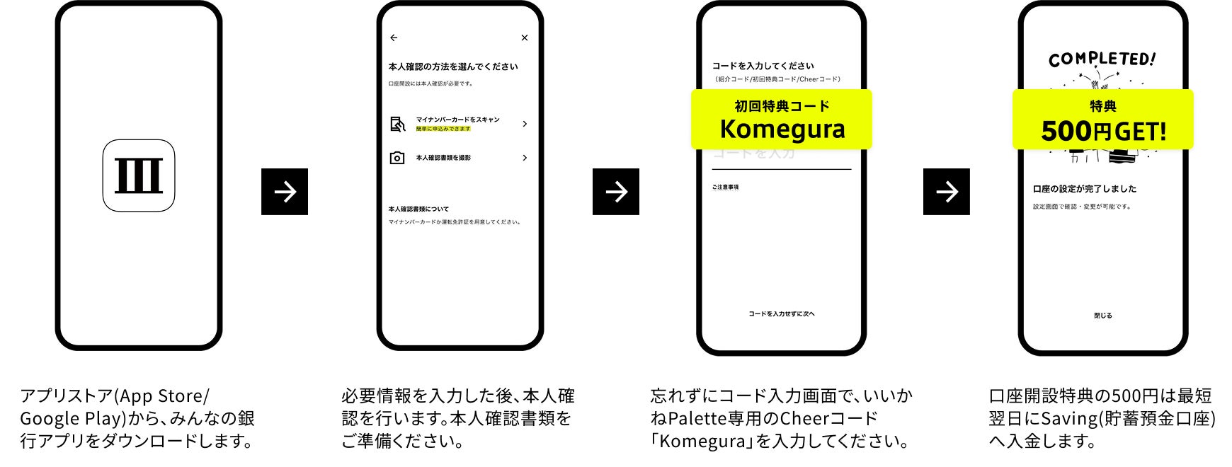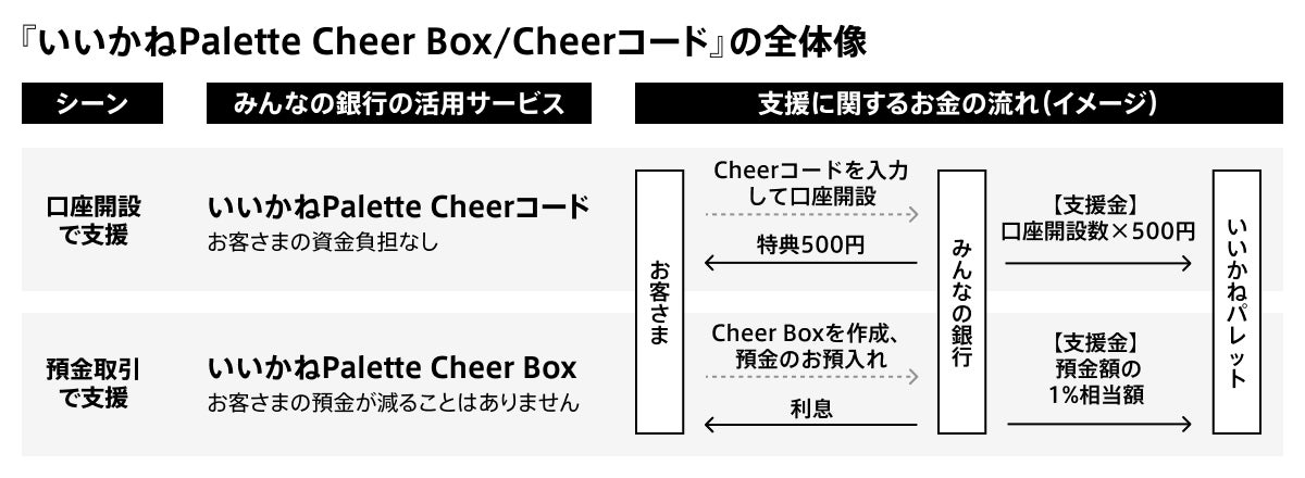 Cheerコードは、みんなの銀行の口座を開設するだけで応援するチームやコミュニティに支援金が送られる仕組みです。口座開設時に下表に記載のCheerコードを入力すると、支援金として500円がみんなの銀行からいいかねPaletteに届けられ、さらには応援特典として開設されたお客さまの口座(貯蓄預金)にも500円がプレゼントされます。