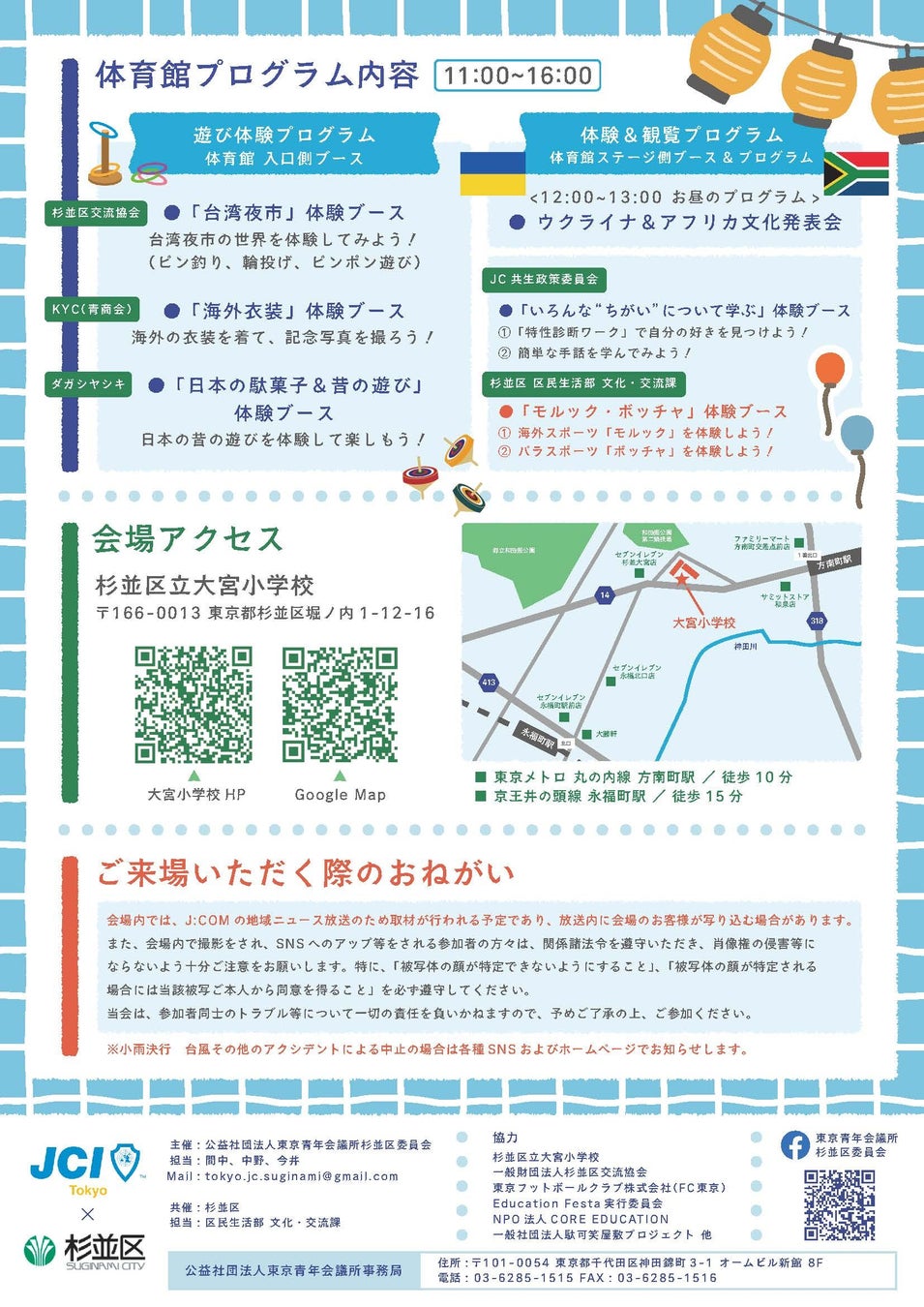 公益社団法人東京青年会議所杉並区委員会は、地域の児童やその保護者を対象に「学び×祭り Education Festa」を開催いたします。このイベントは、杉並区や留学生ボランティアの方々と連携し、多文化共生をはじめとした共生社会の重要性を楽しく学べる場を提供します。海外の遊びを通して外国にルーツのある人と交流できるブースや、海外衣装体験、ウクライナ&アフリカ文化発表会、そして地域飲食店による海外の食事体験など、子供たちと保護者の方が一緒になって多文化を体感して学べるような体験型のイベントになっています。また、「特性診断ワーク」やパラスポーツ「ボッチャ」を体験し、いろんな“ちがい”について体験していただけます。