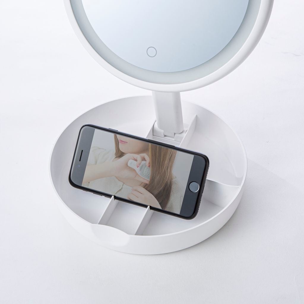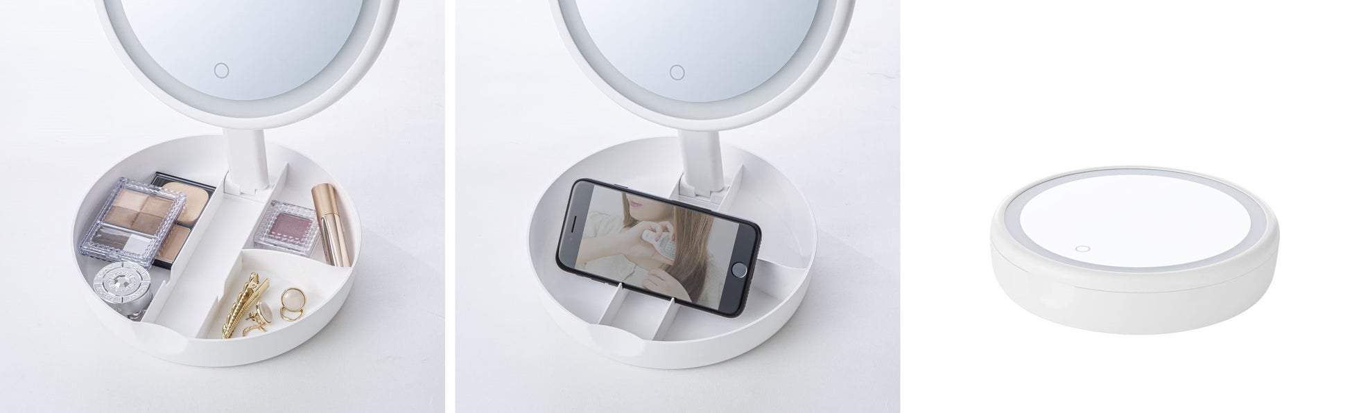 台座部分が小物入れとスマホスタンドになっているため、メイク時に使うものが散らかりにくく、省スペースでメイクができます。口紅などの化粧品を収納したり、動画を見ながらメイクができたり非常に便利です。使用後は、ミラーをたたむだけでそのまま省スペースに収納。持ち運びにも便利です。