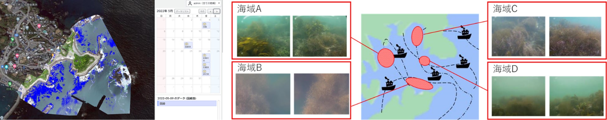藻場データ地図アプリ表示及び観測海域と収集画像データイメージ図
