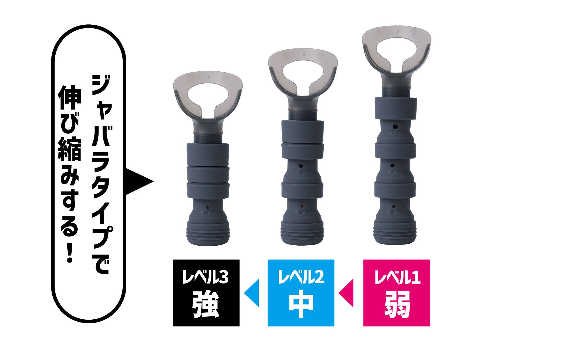 ジャバラタイプで伸ばしたり縮めたりするだけで簡単に3段階の強度を調節できます。お好みのレベルに合わせて使えます。