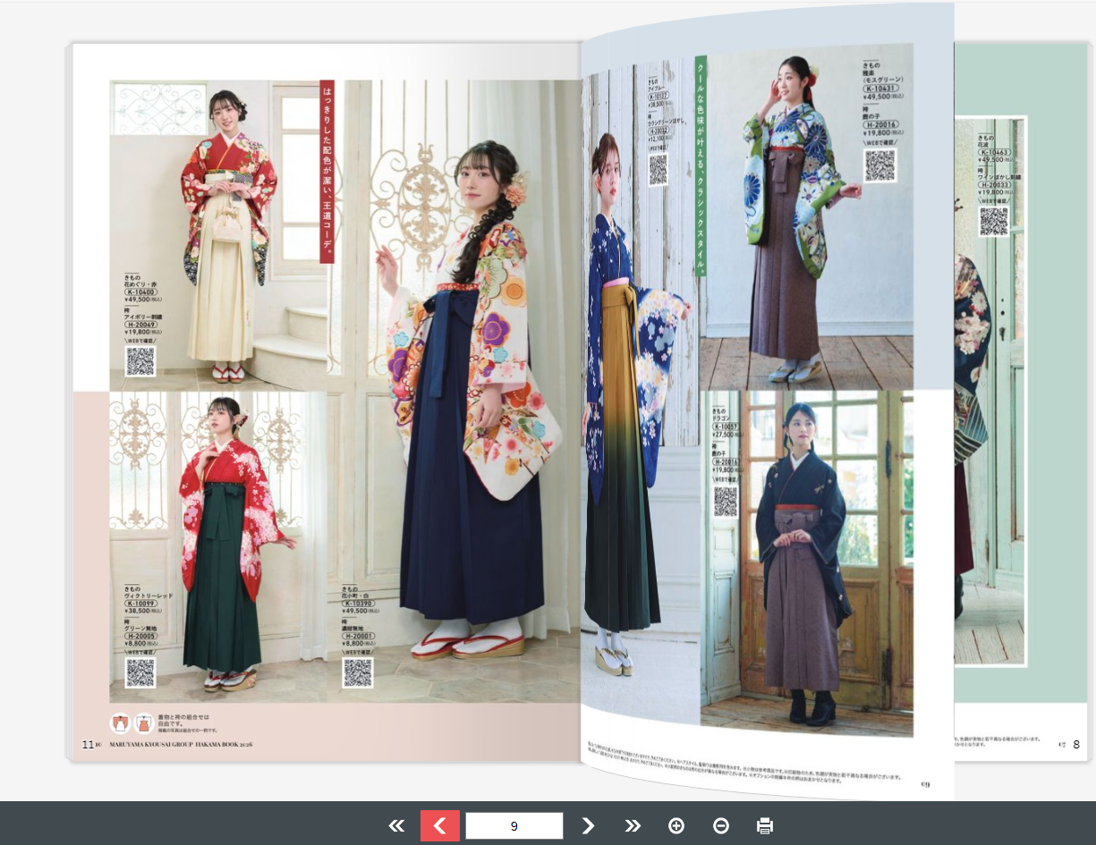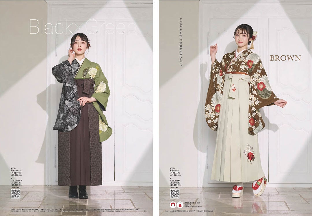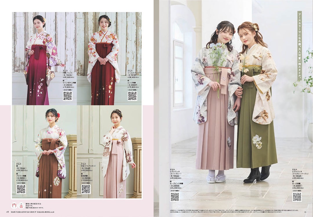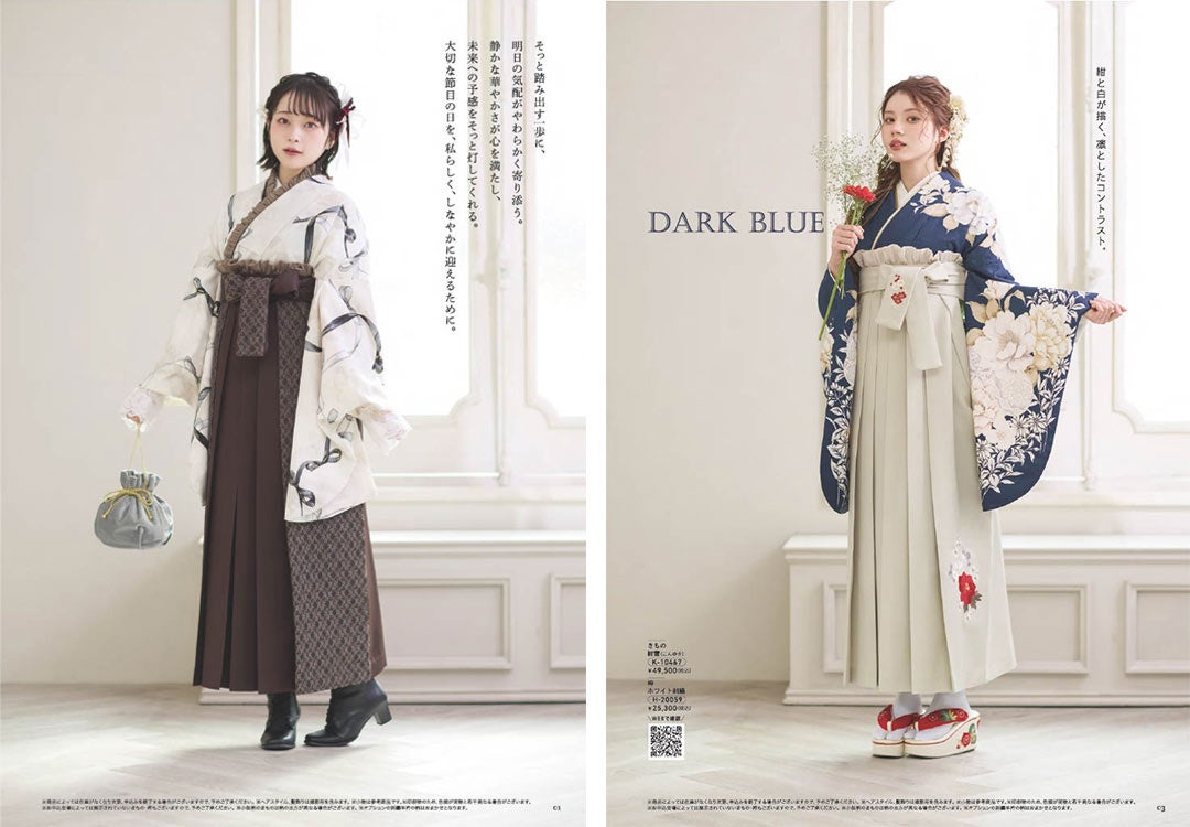 『袴パンフレット2026』では、着物・袴それぞれの魅力が引き立つよう、カラー別にわかりやすく構成しています。