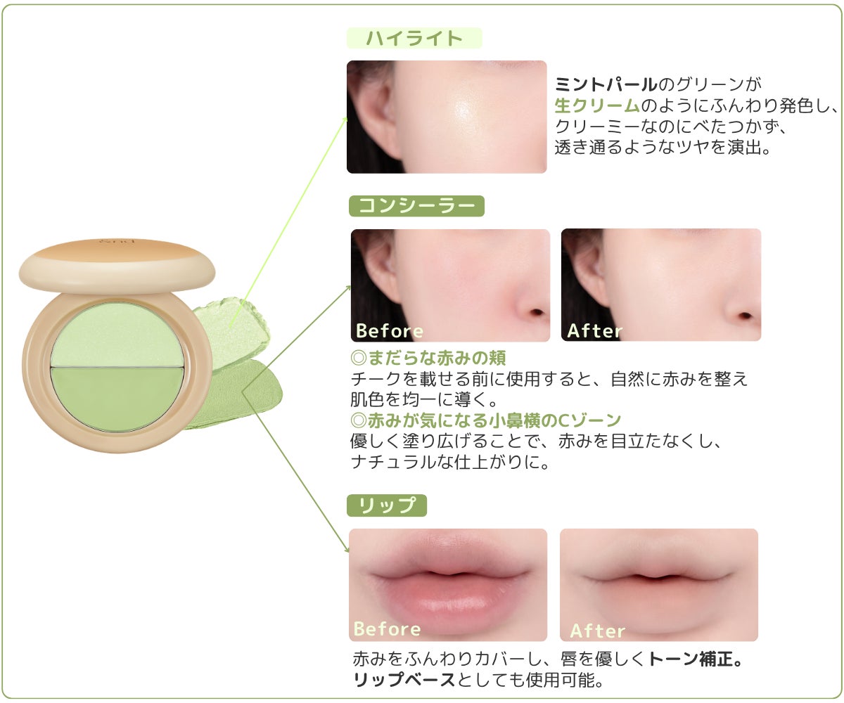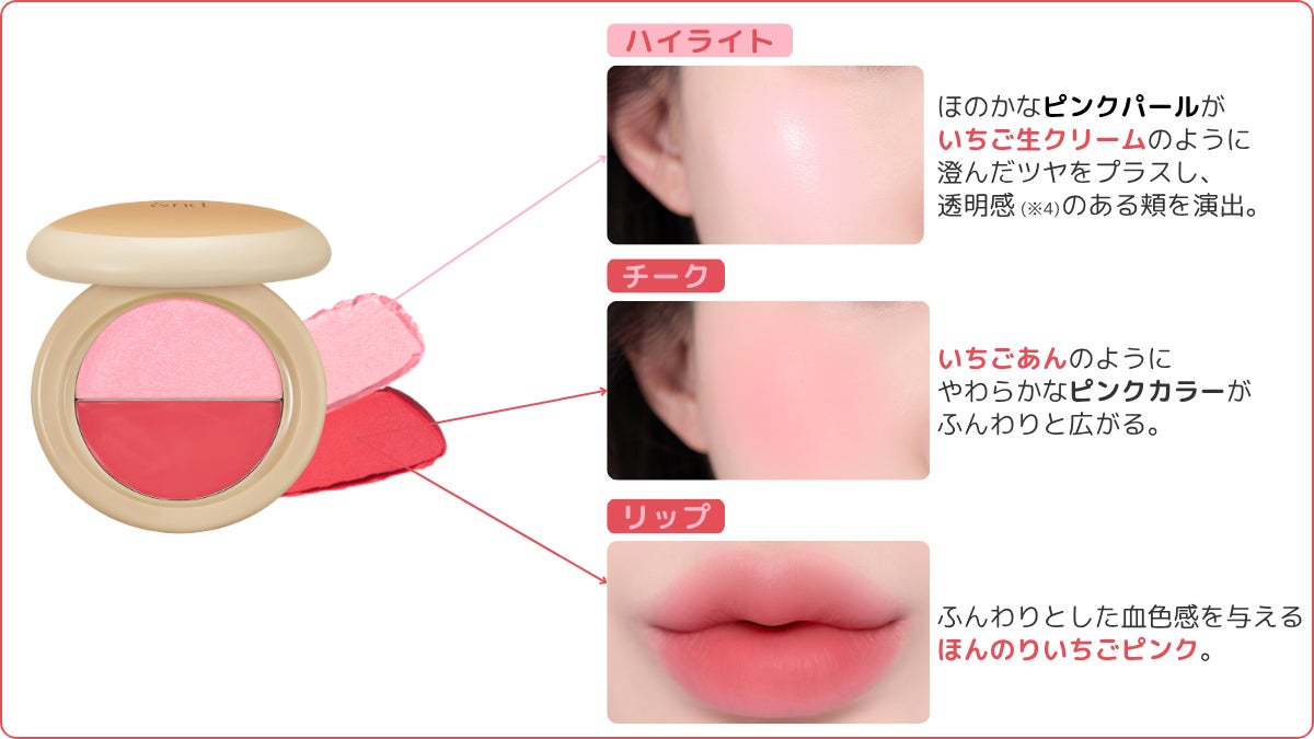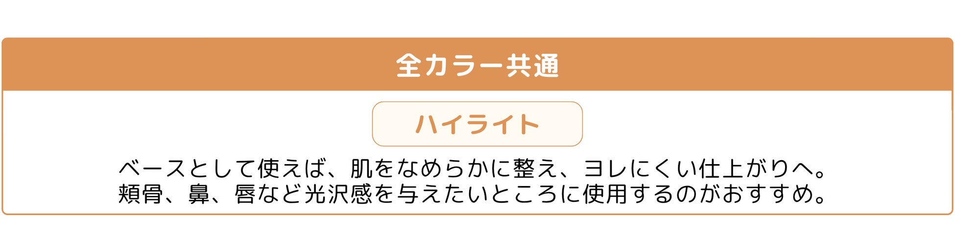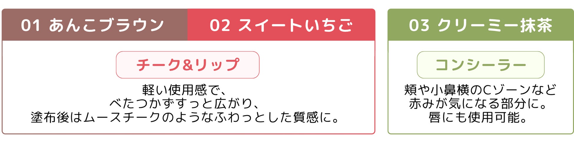 01番,02番はハイライト、チーク、リップ、03番はハイライターコンシーラー、リップの3役。