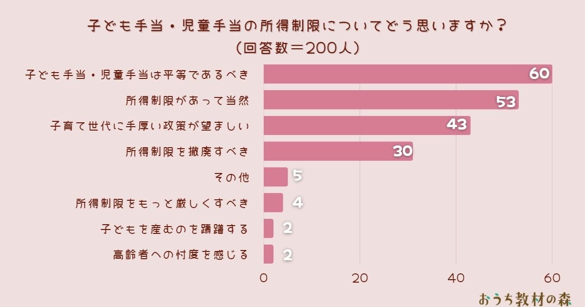 - 【総括】今回のアンケートで子ども手当・児童手当の所得制限についてどう思いますか?1位は『子ども手当・児童手当は平等であるべき』でした