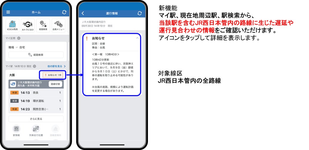 - 「マイ駅」を含む路線で生じた遅延や運行見合わせの情報を、アプリを開いてすぐ確認!