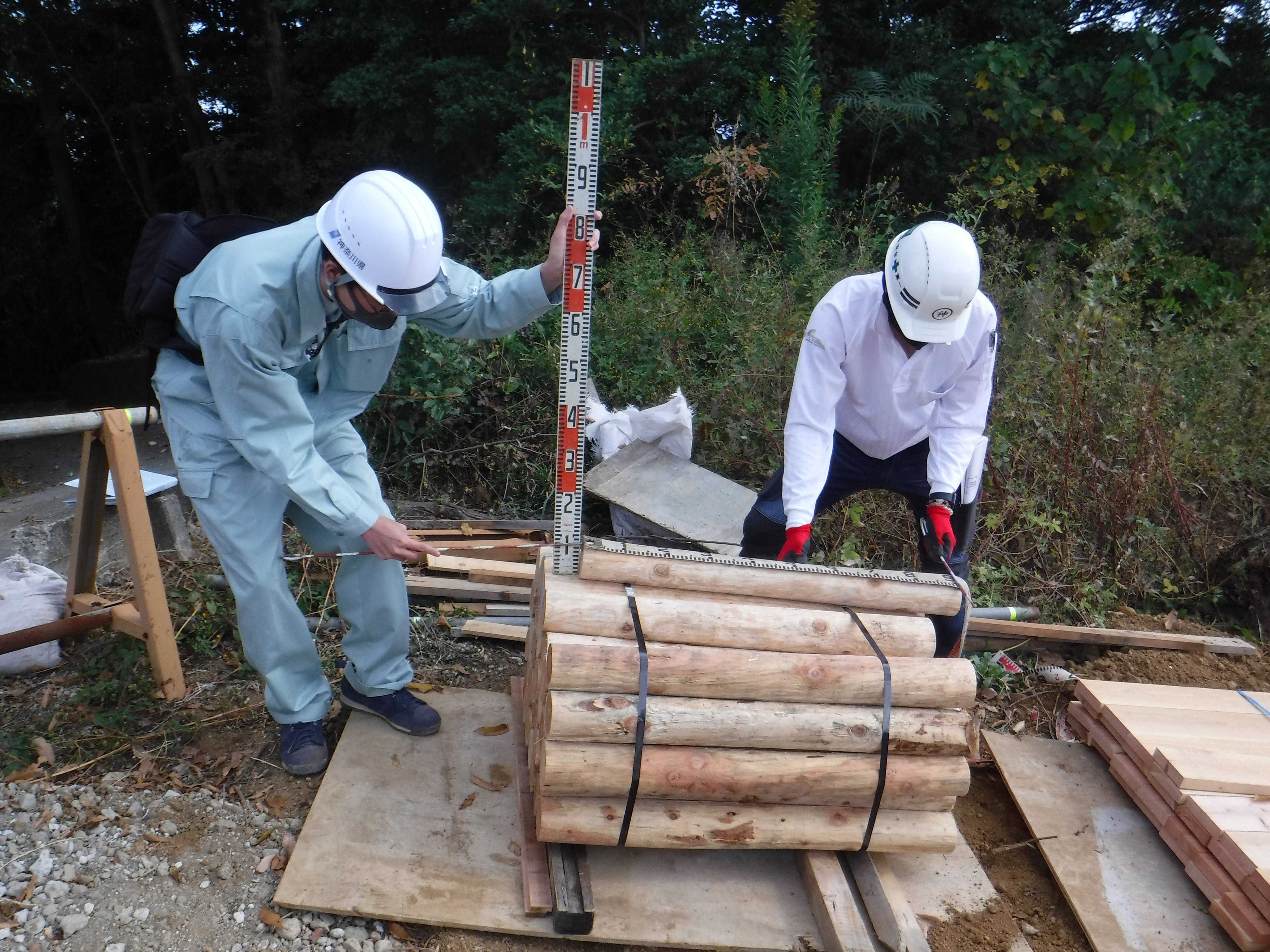 農道工事に必要な材料の検査 ほ場整備後の稲の生育状況を地元農家と調査