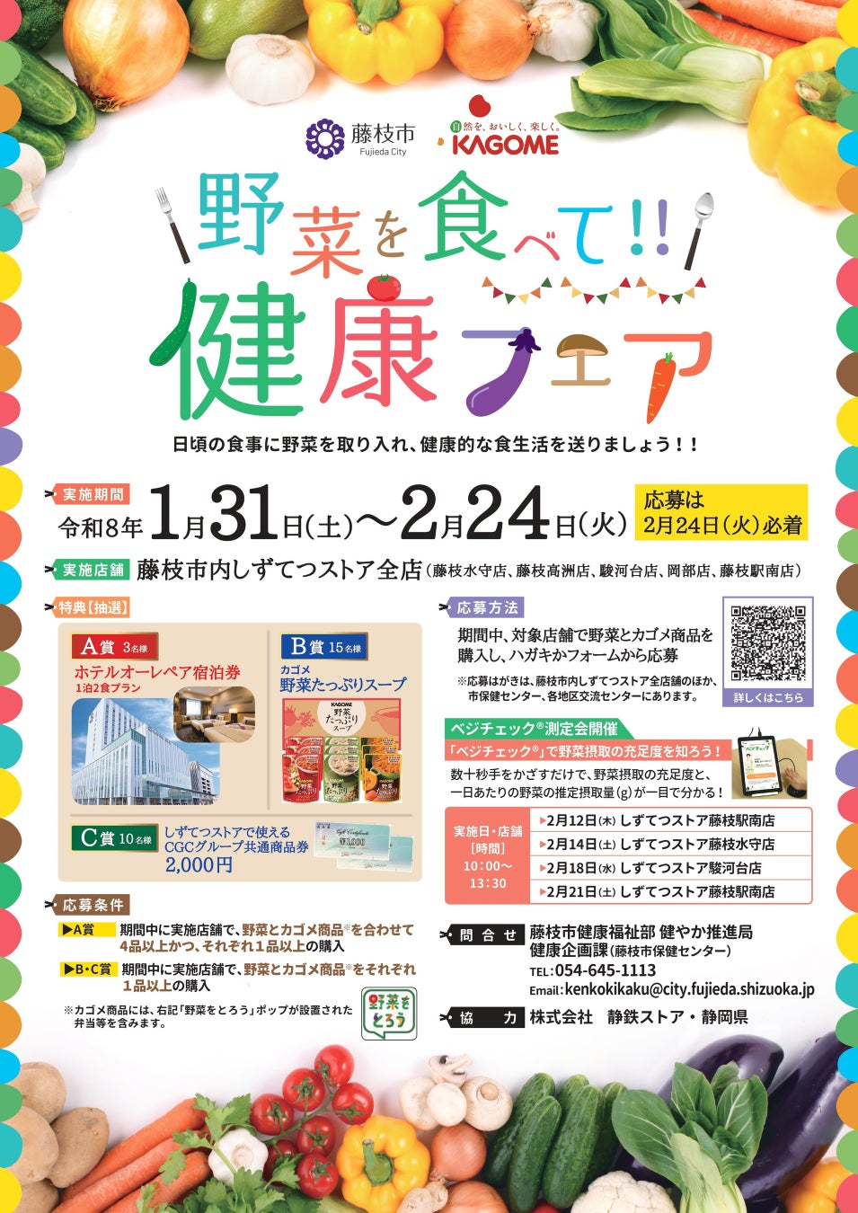 日頃の食事で野菜摂取を促し、健康的な食生活を支援するため、包括連携協定締結企業のカゴメ㈱と静岡県、しずてつストアと協働し、実施店舗で野菜とカゴメ商品を購入した人に特典を進呈する「野菜を食べて!!健康フェア」を開催します。
