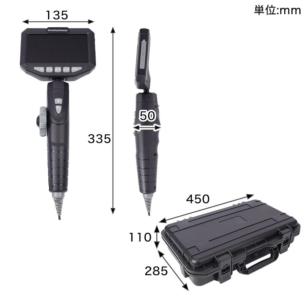 本製品は先端カメラ径3.9mm、先端にカメラを搭載し手元操作でカメラが動く工業内視鏡です。