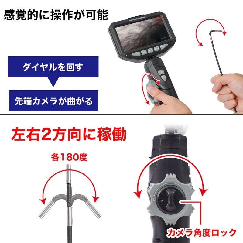 ケーブル長1m。先端カメラは手元のダイヤル操作で左右それぞれ180度スムーズに動き、確認したい場所にカメラを合わせることが可能です。自由に曲げられるフレキシブルケーブルを採用。IP67防水性能(カメラケーブル部)。