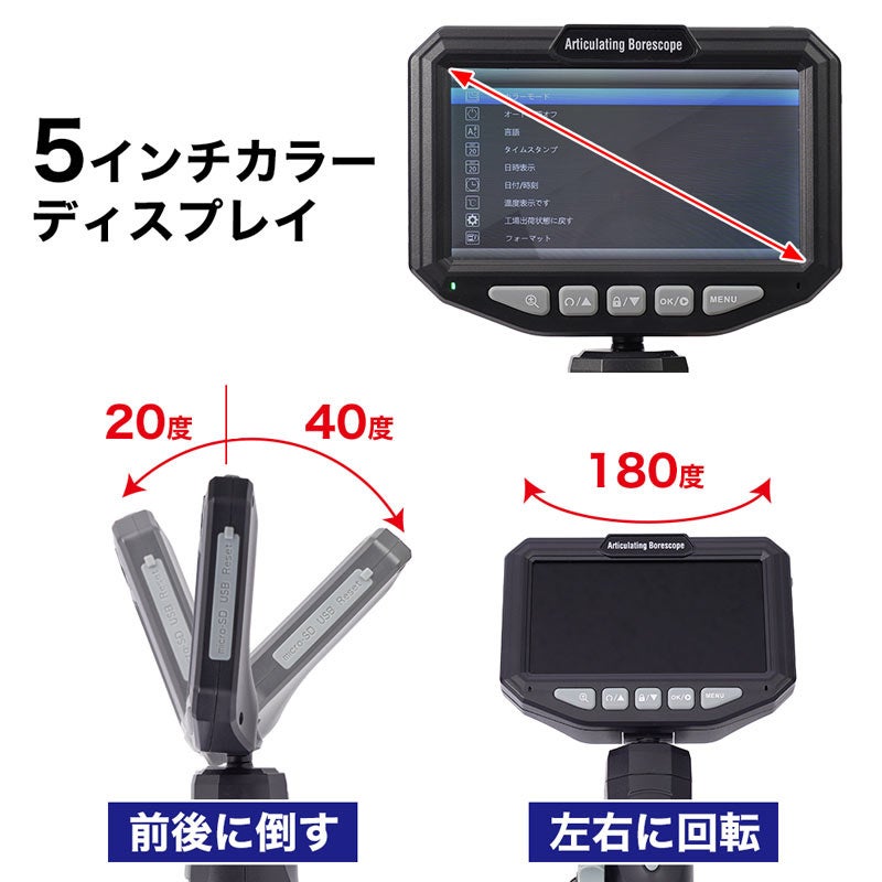 3段階の明るさ調整が可能なライトを搭載。USB充電式で最大約3.5時間稼働。静止画、動画の記録が可能。5インチディスプレイを採用。